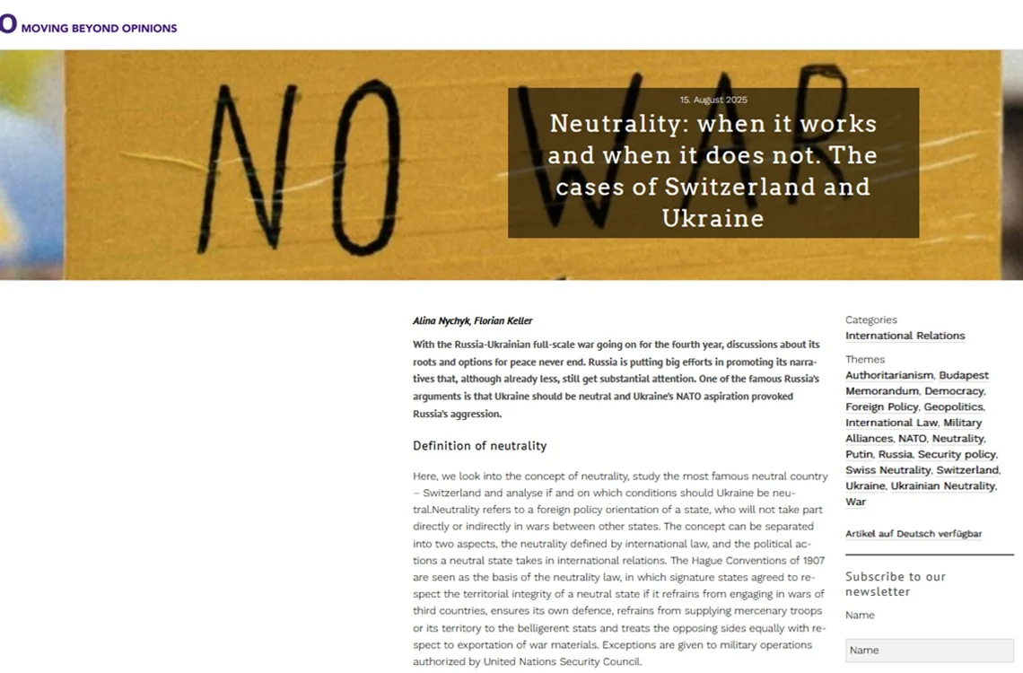 With the Russia-Ukrainian full-scale war going on for the fourth year, discussions about its roots and options for peace never end. Dr. Alina Nychyk and Prof. Dr. Florian Keller from the ZHAW Center for Geopolitics and Competitiveness explore the Swiss and Ukrainian concepts of neutrality and examine to what extent they should be applied in the context of current and potential military escalation.