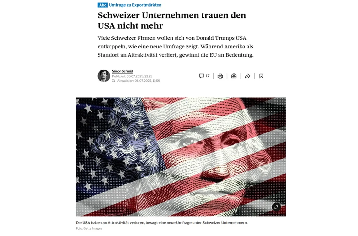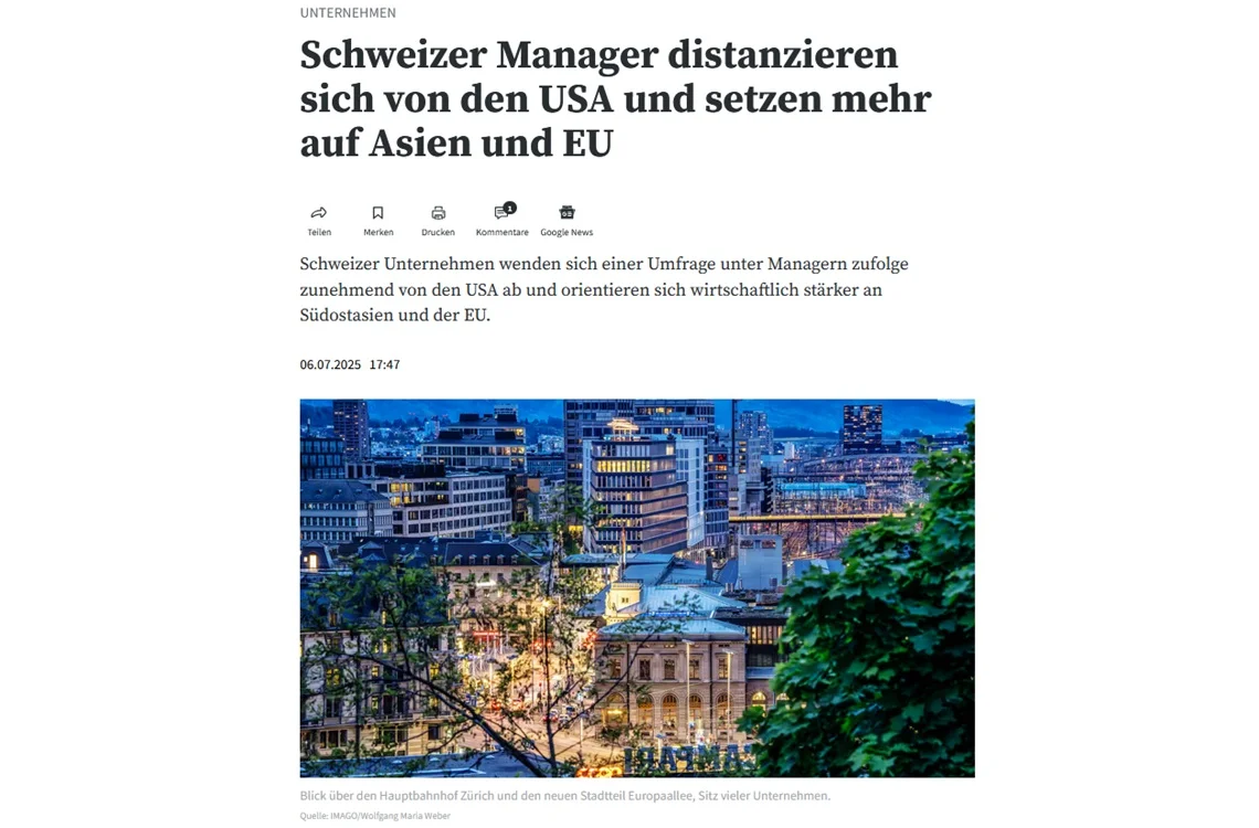 Almost two-thirds of 280 surveyed executives stated that their perception of the United States had worsened over the past year. At the same time, 38 percent viewed the EU more positively, with the same figure applying to Southeast Asia—where negative responses were under 10 percent, according to the Swiss Managers Survey 2025 conducted by ZHAW.