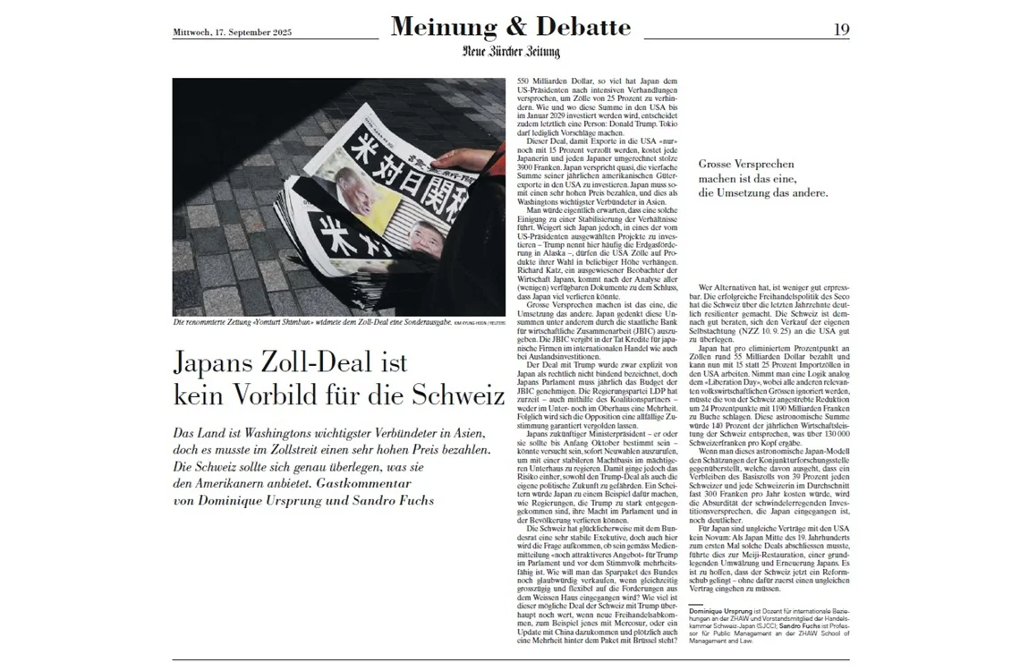 Japan is actually Washington’s most important ally in Asia. Yet no other country has had to pay such a high price in the tariff dispute as Japan. Switzerland would be well advised to think carefully about what it offers the Americans, say Dominique Ursprung of the ZHAW Center for Geopolitics and Competitiveness and Prof. Sandro Fuchs of the ZHAW Public Sector Financial Management unit.