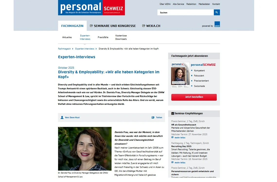 Diversity and employability are on everyone’s lips — and yet, since Trump’s presidency, equality issues have faced a noticeable backlash, including in Switzerland. At the same time, employees over 50 still encounter obstacles. Dr Daniela Frau, Diversity Manager Delegate at the ZHAW School of Management and Law, talks in the cover interview about progress and setbacks in inclusion and equal opportunities, as well as the underestimated role of age. And she explains why diversity remains ineffective without inclusive leadership behaviour.