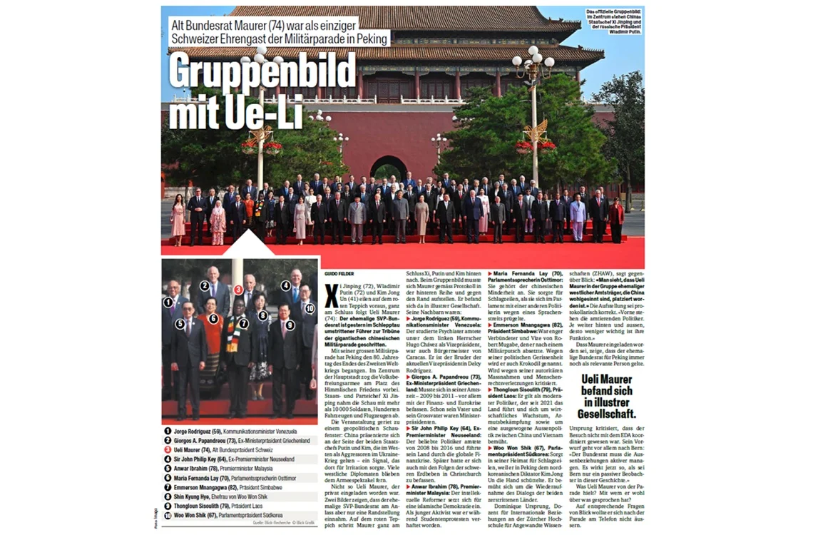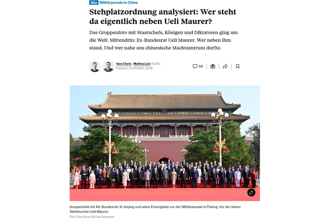Former Bundesrat Ueli Maurer was the only Swiss guest of honour to attend the Chinese military parade marking the 80th anniversary of the end of the Second World War. Blick reveals who he had to stand next to for the photos and how important the Chinese consider him, based on an analysis by ZHAW expert Dominique Ursprung.