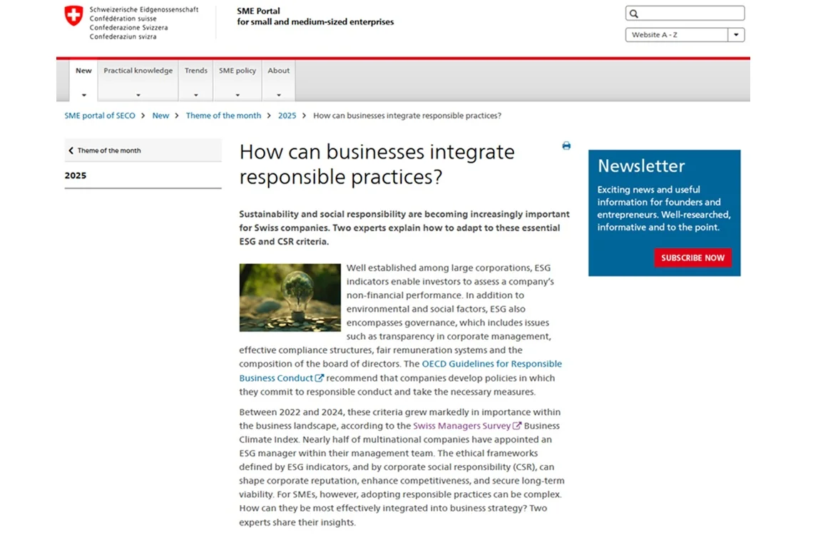 Sustainability and social responsibility are becoming increasingly important for Swiss companies. In the SME Portal's “Theme of the month”, Prof. Christian Vögtlin, Co-Lead of the ZHAW Zurich Center for Sustainability Leadership, explain how to adapt to these essential ESG and CSR criteria.