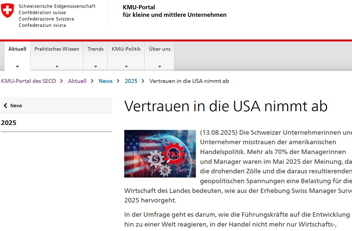 Swiss business leaders express growing mistrust toward U.S. trade policy. More than 70% of senior executives believe that the threat of tariffs and the resulting geopolitical tensions have weighed on the Swiss economy, according to the ZHAW Swiss Manager Survey 2025, conducted in May.