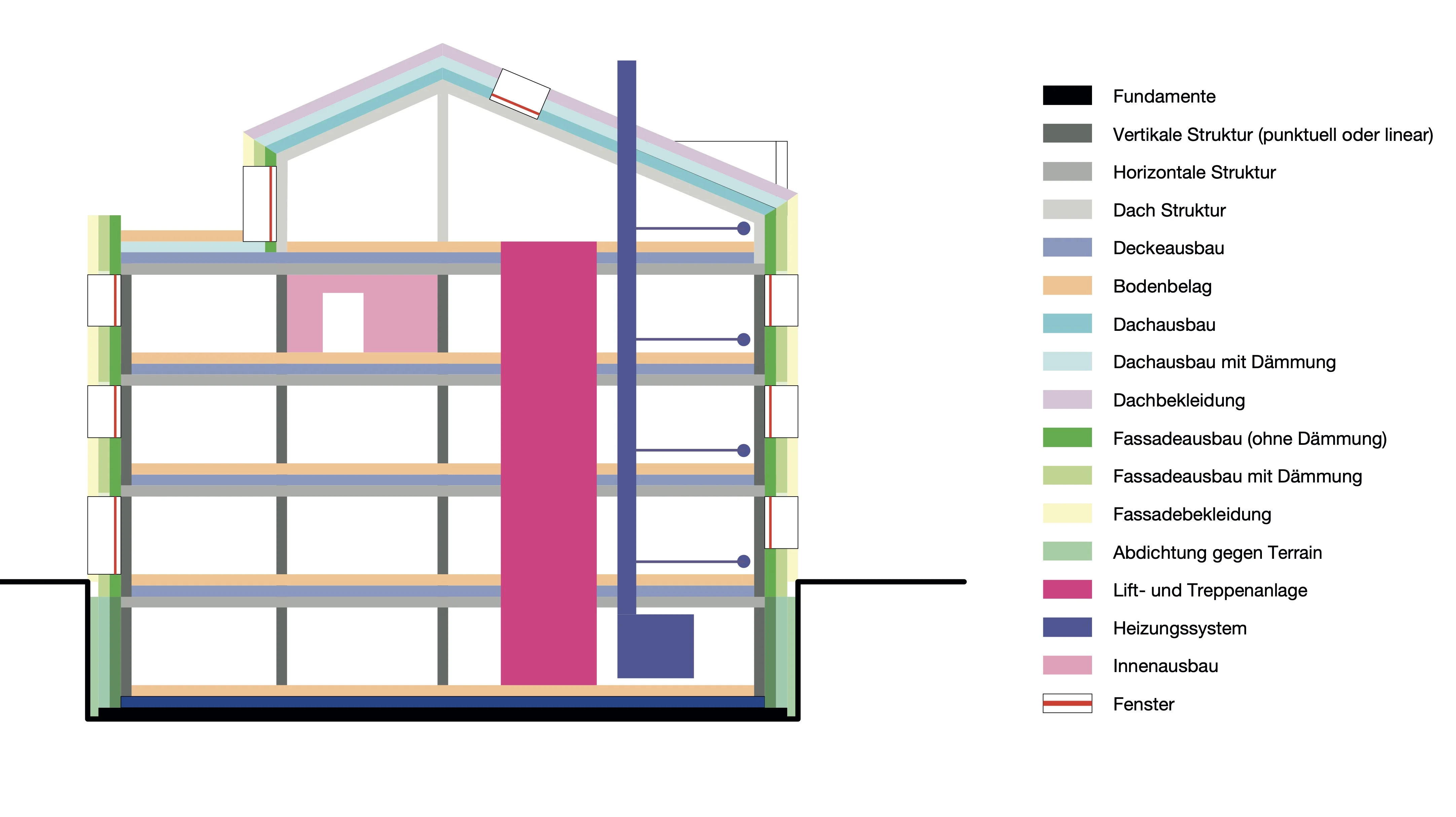Eine der wichtigsten Grundlagen für die Förderung einer zirkulären Bauwirtschaft fehlt bislang: die systematische Identifikation und Katalogisierung des Gebäudebestands im Hinblick auf dessen Transformationspotenzial. Es gilt zu beurteilen, wie bestehende Gebäude weitergenutzt werden können – durch Umbau, Erweiterung oder Aufstockung – und welches Potential an wiederverwendbaren Bauteilen die Bausubstanz beim Rückbau aufweist. Solche Untersuchungen werden aktuell sehr aufwendig in Form von Pre-Demolition-Audits (PDA) an Einzelobjekten durchgeführt, etwa mit Abklärungen zu Schadstoffen und Materialproben mittels Kernbohrungen. Zwar erlauben digitale Methoden eine quantitative Analyse von grösseren Beständen, diese liefern jedoch zu wenige Informationen über die konstruktiven Eigenschaften der Materialien und deren mögliche Verwendung. Um diese Lücke zu schließen, braucht es Instrumente für eine systematische Erfassung und Typologisierung der Gebäude nach Baujahr und Konstruktionsart. Mit einer solchen Erhebung sollen konkrete Informationen gesammelt werden über die Konstruktionsart, die Möglichkeiten der Transformation, die Gefahren von Schadstoffen sowie das Wiederverwendungspotenzial von Bauteilen. Die gewonnenen Daten werden in einer Matrix zusammengeführt, welche eine Bewertung des Bestands erlaubt, als Grundlage einer Vorentscheidung für potentielle Transformationen. Somit wird die Potenzialeinschätzug von Immobilienportfolios ermöglicht, ohne die aufwändige Analyse am Einzelobjekt durchführen zu müssen.