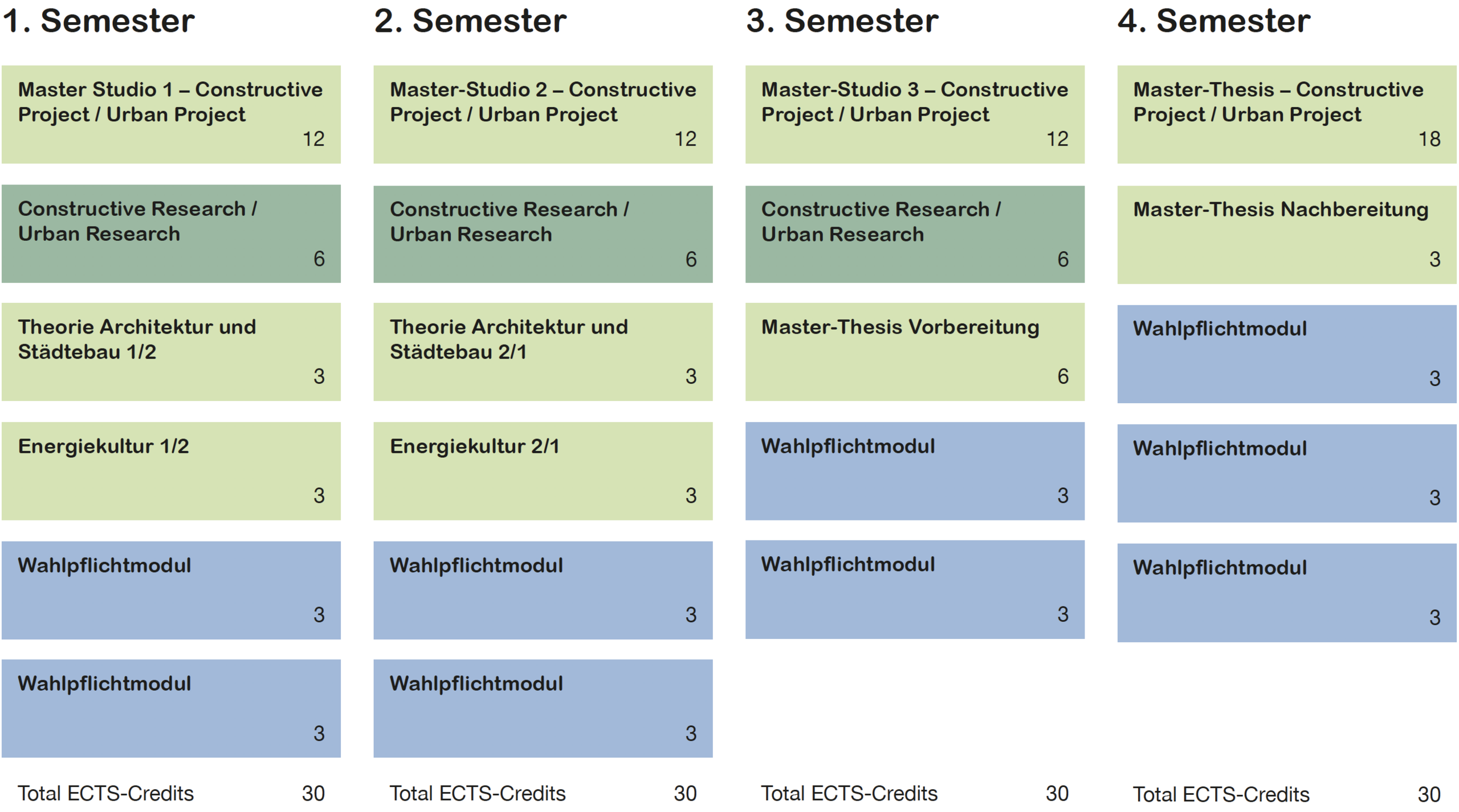 Das zweijährige Masterstudium Architektur ist modular aufgebaut. Es umfasst 120 Credits und besteht aus Pflicht- und Wahlpflichtmodulen. Das Studium ist gegliedert in drei Studio-Semester und ein abschliessendes Thesis-Semester.