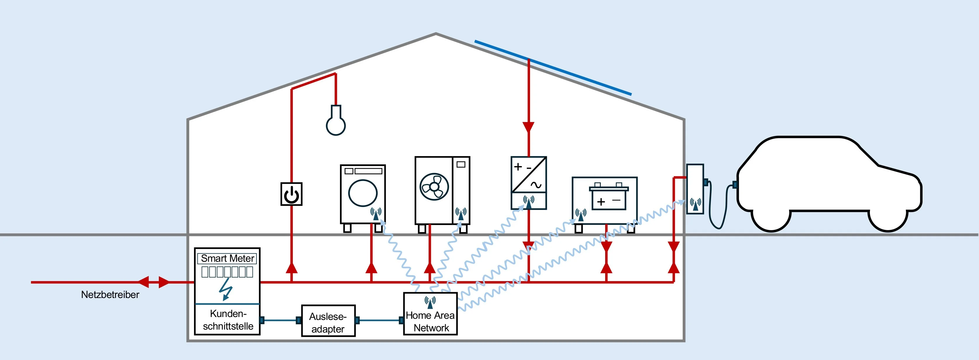 Der Ausleseadapter liefert dem Home Area Network – das über unterschiedliche Schnittstellen mit grossen Verbrauchern (z. B. Wärmepumpe, Waschmaschine), Speichern (Batteriespeicher) und Erzeugern (PV-Anlage) kommuniziert – die nötigen Informationen, ob Geräte zu- oder abgeschaltet werden sollen, um den Energieverbrauch optimal zu steuern. Auf diese Weise kann der Stromverbrauch kostengünstig optimiert, der Eigenverbrauch von PV-Strom erhöht und der Batteriespeicher effizient genutzt werden.