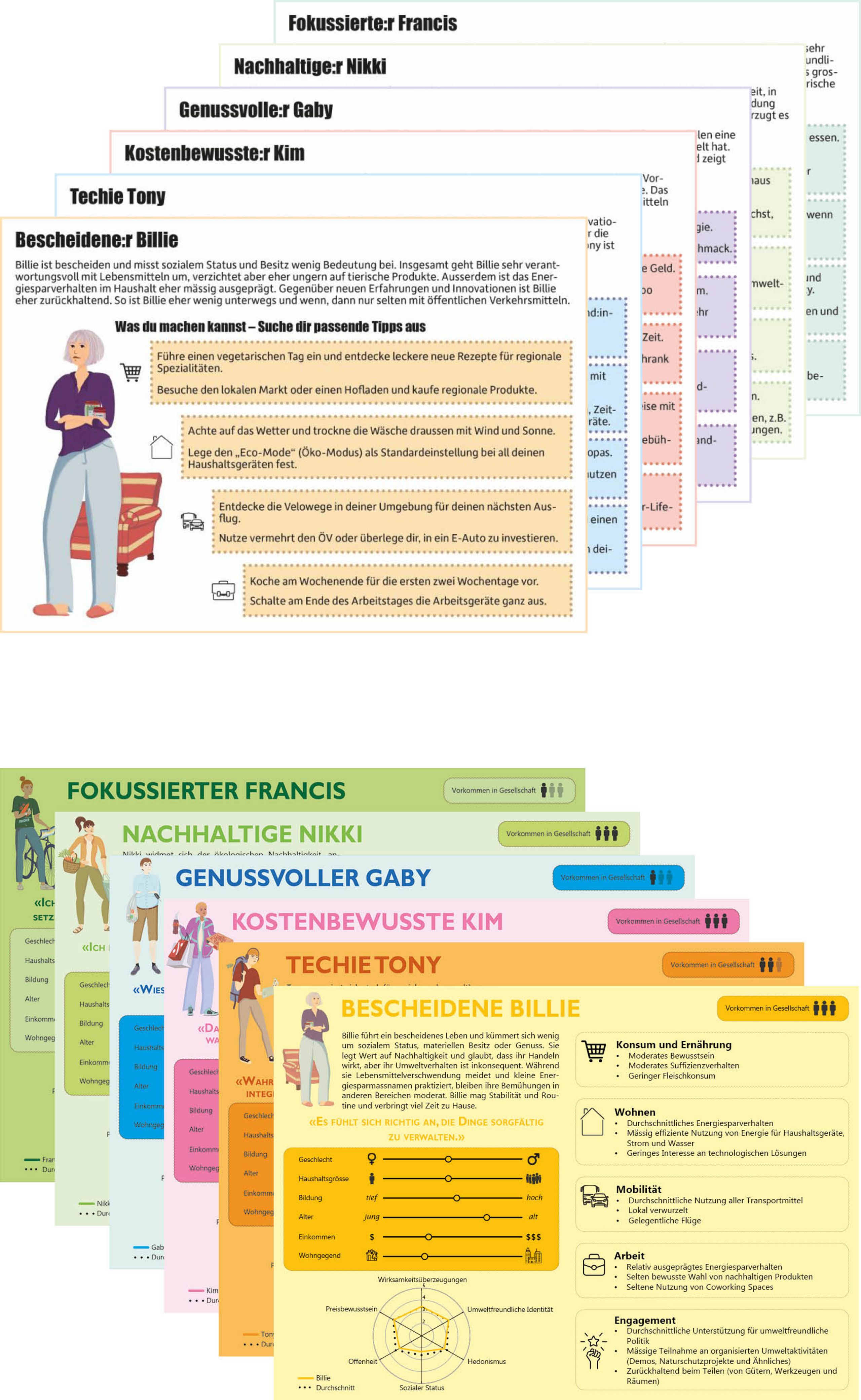 - Die Sustainability Persona Cards: Persona-Karten, die auf den Schweizer Typologie nachhaltiger Lebensstile basieren, um die Nutzerorientierung in Co-Creation-Prozessen zu stärken.