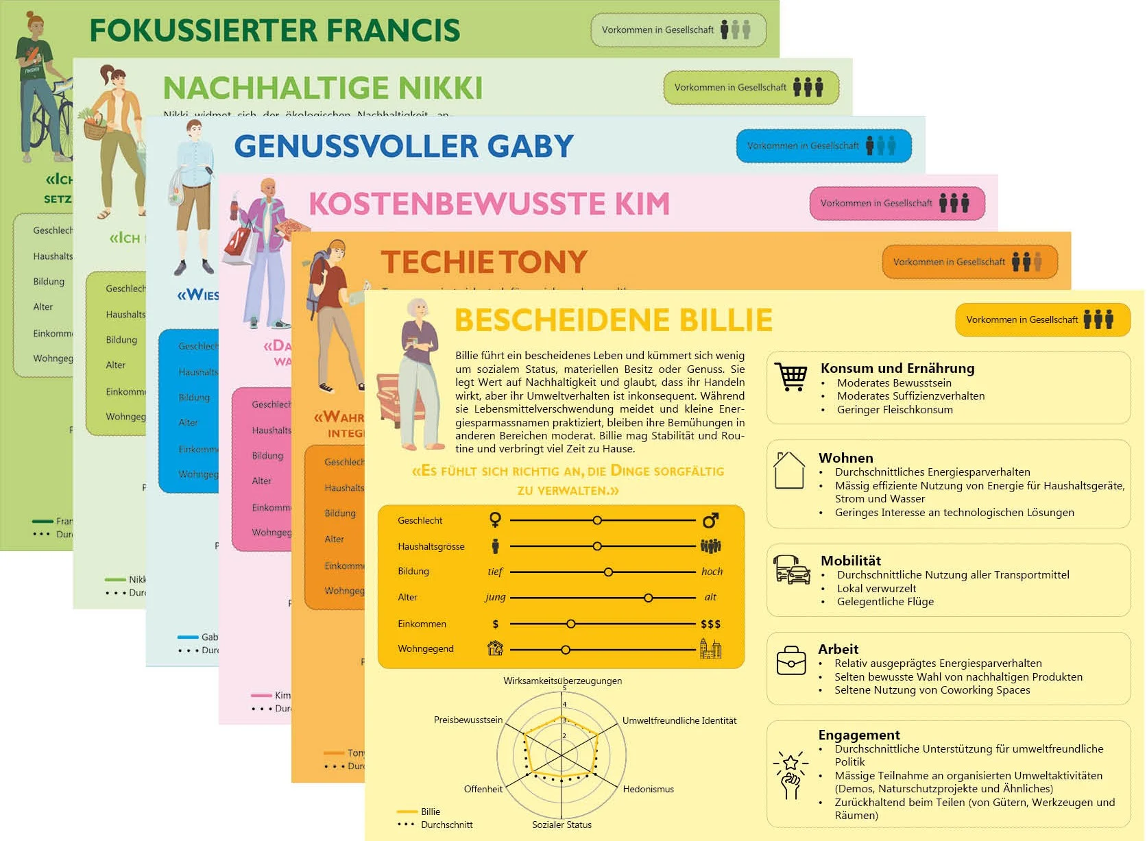 Das Tool besteht aus sechs Sustainability Persona Cards, die auf der Schweizer Typologie nachhaltiger Lebensstile basieren und durch eine semi-systematische Auswertung internationaler Forschungsergebnisse untermauert sind. Die Karten stellen eine Vereinfachung der Beschreibungen der sechs Schweizer Nachhaltigkeits-Lebensstiltypen dar, um ein benutzerfreundliches, intuitives Format für Co-Creation-Prozesse mit verschiedenen Interessengruppen zu bieten. Die Karten können auch als Grundstruktur dienen, die an verschiedene Kontexte, Themen oder kommunale Szenarien wie Mobilität, Energie oder Ernährung angepasst werden kann.