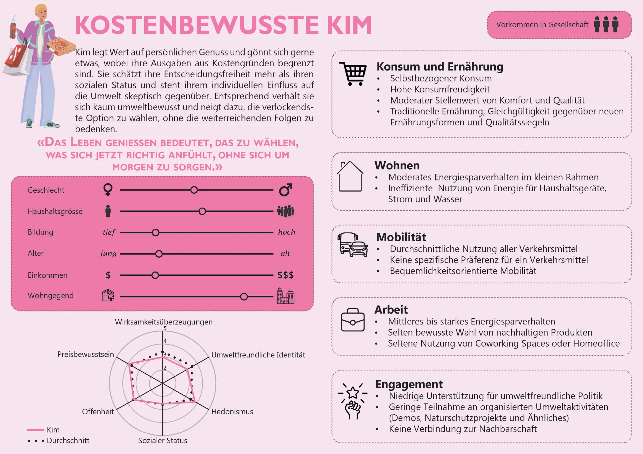 - Zusammenfassende Beschreibung: Kurze Beschreibung der Persona mit den charakteristischsten Einstellungen, Präferenzen, Ausrichtungen und Verhaltensweisen, die für Nachhaltigkeitsprojekte relevant sind
