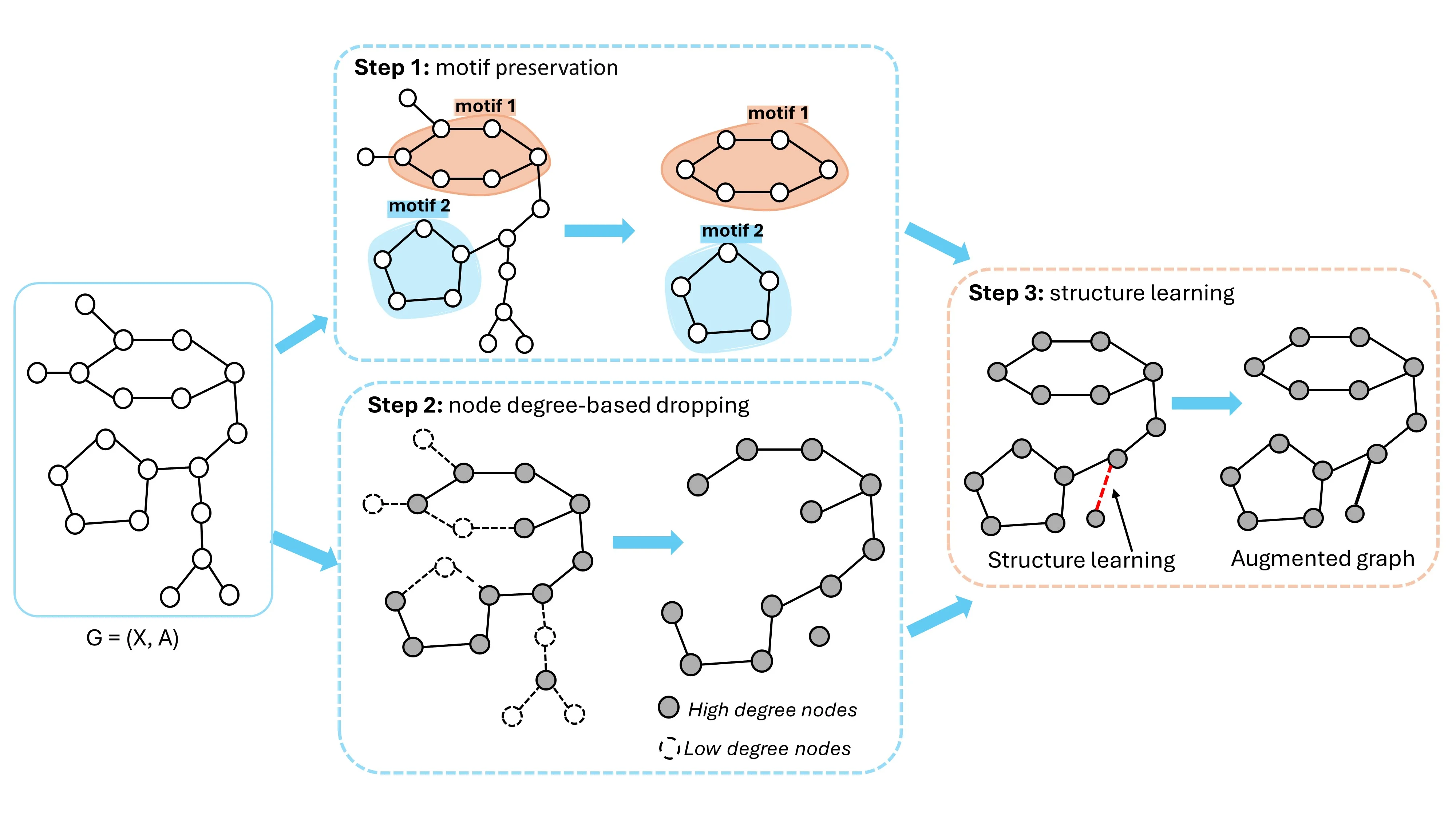 1. Motivbewahrung: Identifiziert wichtige Teilstrukturen (Motive) im ursprünglichen Graphen, wie z. B. chemische Funktionsgruppen in Molekülgraphen, und stellt sicher, dass diese während der Augmentierung erhalten bleiben.