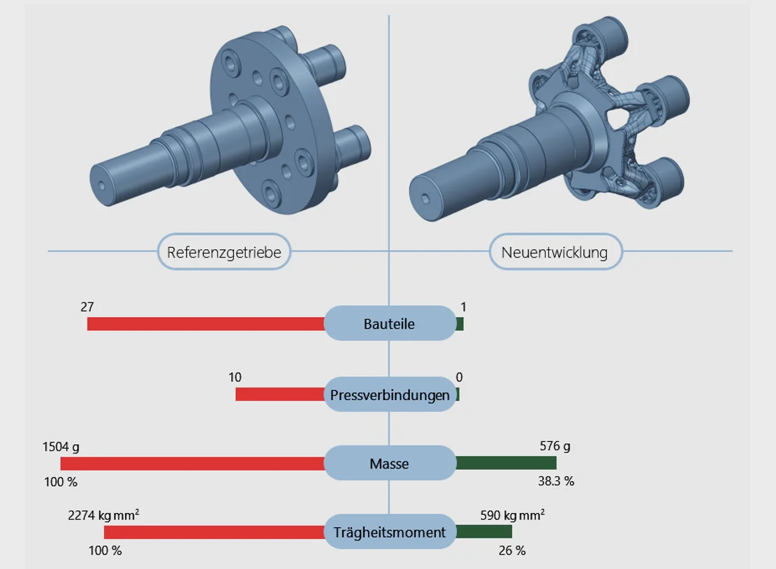 Ziel des Projekts: Ziel der Studie war es, das Potenzial der Performanceverbesserung von Getriebekomponenten durch Hybridfertigung – also die kombinierte Nutzung von Drehbearbeitung, additiver Fertigung – aufzuzeigen. Hierzu wurde die Bauteilgeometrie so gestaltet, dass die jeweiligen Stärken der jeweiligen Fertigungsverfahren optimal miteinander verknüpft werden konnten. Auf diese Weise wurde eine Reduktion des Trägheitsmoments um 74 % erreicht.