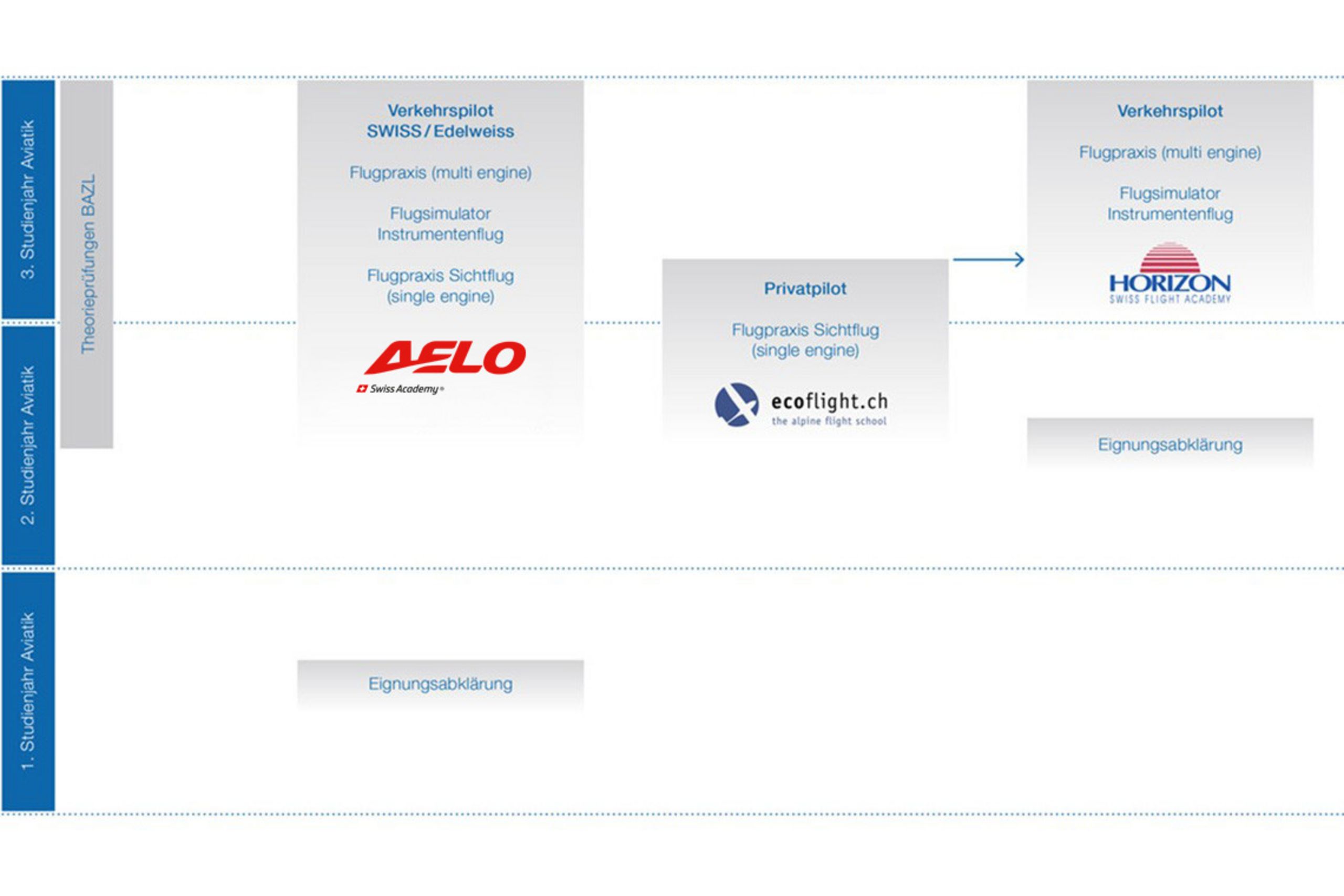 Das Studium Aviatik kann mit der Ausbildung zum:zur Verkehrspilot:in kombiniert werden. Diese Möglichkeit ist einzigartig in der Schweiz und erlaubt eine verkürzte Ausbildungszeit, da die akademische Basis für den Theorieteil des Airline Transport Pilots bereits während des Studiums vermittelt wird. Die praktische Ausbildung erfolgt während der unterrichtsfreien Zeit bei Partnerunternehmen.