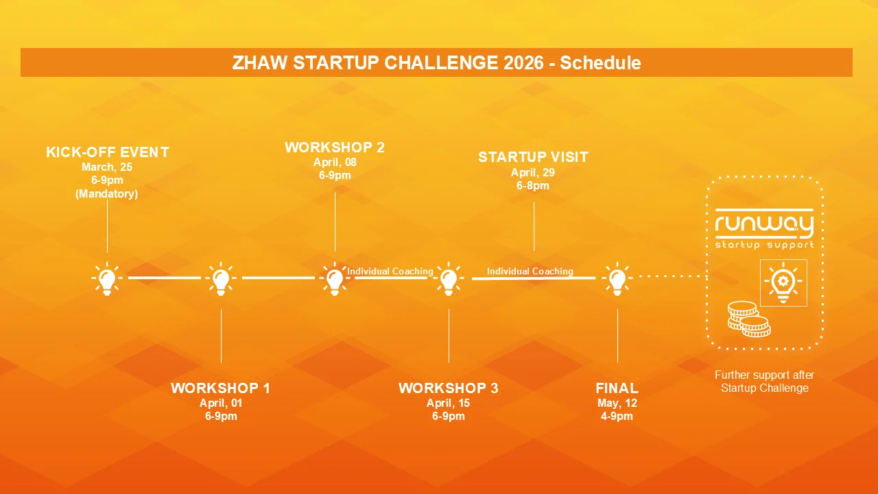 Mit deiner Anmeldung zur ZHAW Startup Challenge bestätigst du deine Teilnahme am Kick-Off Event, wo du alle weiteren Informationen erhältst. Wir empfehlen dir ebenfalls an den drei Workshops, dem individuellen Coaching sowie dem finalen Pitch-Event, wo Preise für die besten drei Ideen verliehen werden, teilzunehmen.