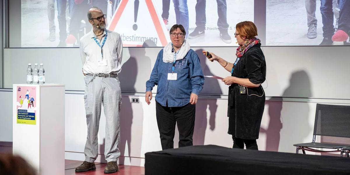 Auch die Referierenden vom Team SEGEL, Peter Ladner, Corinne Wohlgensinger und Karin Zingg, plädieren für eine bewusste Auseinandersetzung mit Vorurteilen. Das partizipative Forschungsteam hat unter anderem einen Gesprächsleitfaden entwickelt, mit dem Menschen mit und ohne Beeinträchtigungen schwierige Entscheidungen rund um das Thema Selbstbestimmung gemeinsam bearbeiten können. Am Gipfel stellen sie – teilweise in Rollenspielen – drei Thesen vor, die eine Balance zwischen Fürsorge und Selbstbestimmung ermöglichen sollen. Erstens bestehe im therapeutischen Kontext weiterhin die Gefahr von Fremdbestimmung, selbst wenn anderes propagiert werde. Zweitens könne (Ergo)therapie nur dann zu mehr Selbstbestimmung beitragen, wenn Klient:innen als Expert:innen ihres eigenen Lebens einbezogen und tatsächlich «reale Wahlmöglichkeiten» geschaffen würden. Drittens brauche es die Reflexion der eigenen Position sowie der institutionellen Rahmenbedingungen und Machtasymmetrien. Zum Schluss fasst Karin Zingg die Essenz zusammen: «Ich brauche beides – eine Weggefährtin, aber auch eine Bergführerin, wenn ich nicht weiss, wie ich auf den Gipfel komme.»