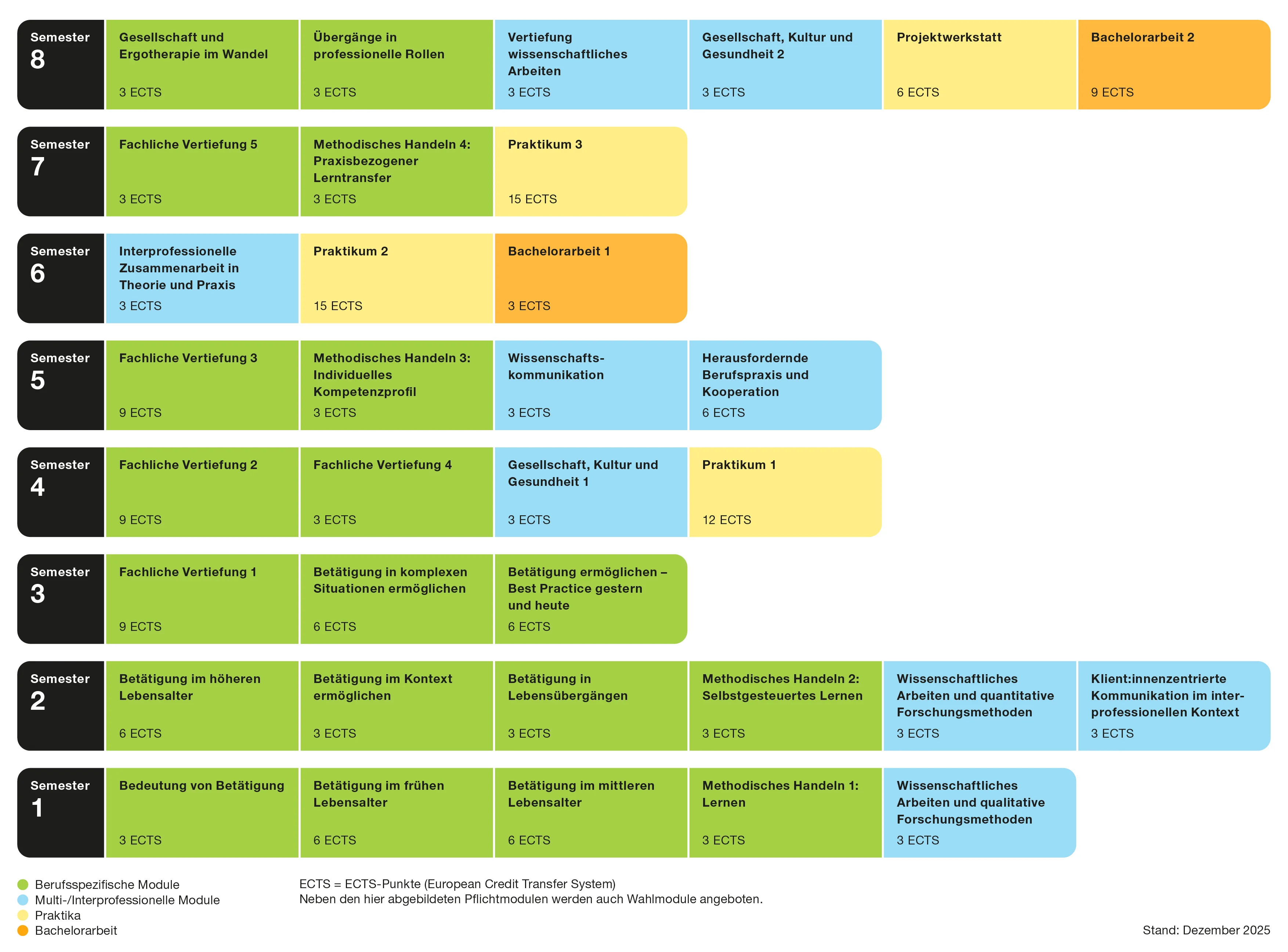 - Berufskontext: Arbeitsorte und Organisationskulturen, Berufsgeschichte, Berufsethik und Berufspolitik, Gesundheits- und Sozialwesen.