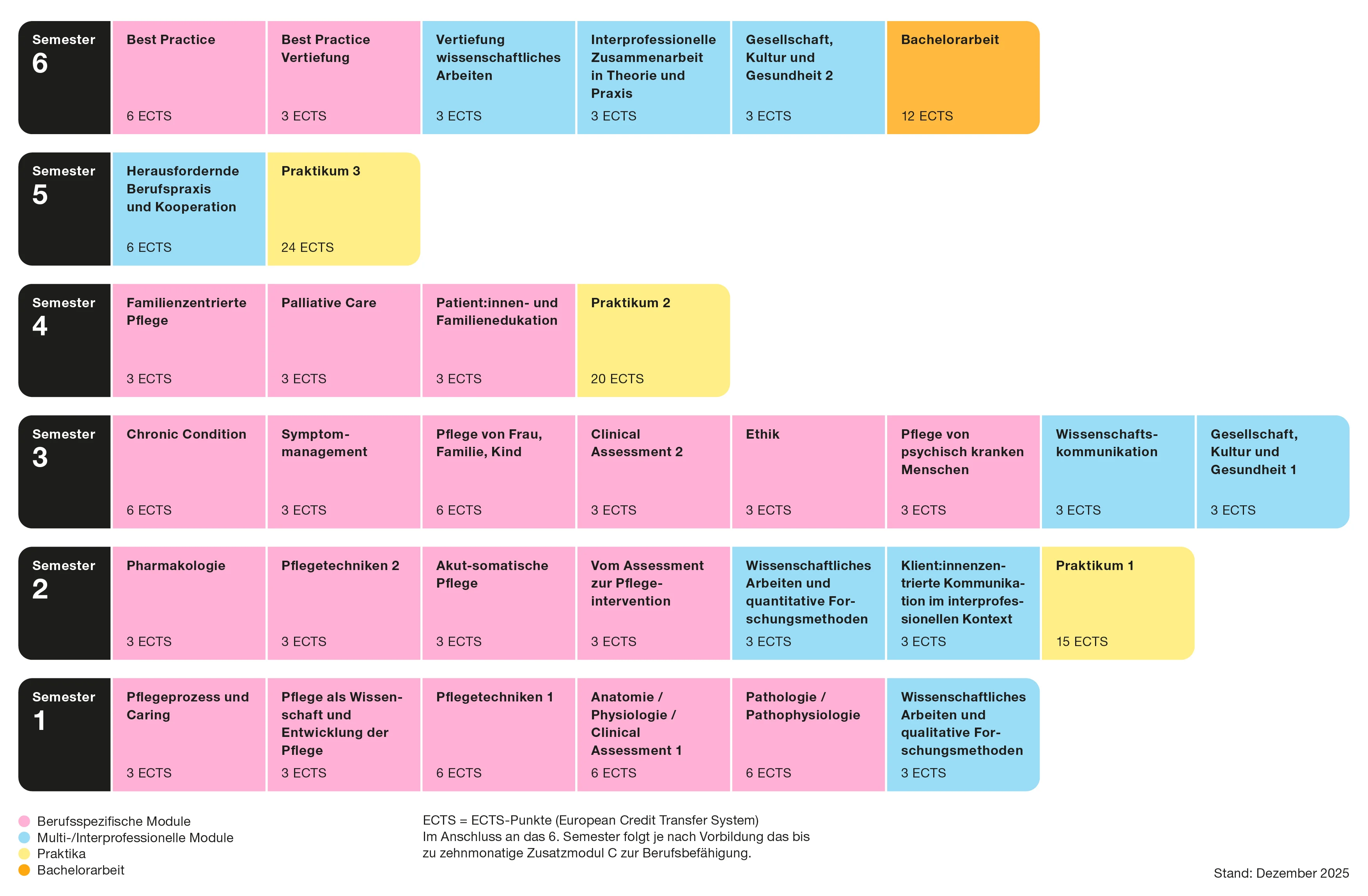 - Grundlagen professioneller Pflege: naturwissenschaftliche Grundlagen, Pflege als Wissenschaft, Pflegeprozess, Caring, Symptommanagement, Pflege spezifischer Alters- und Patientengruppen, Ethik, Edukation