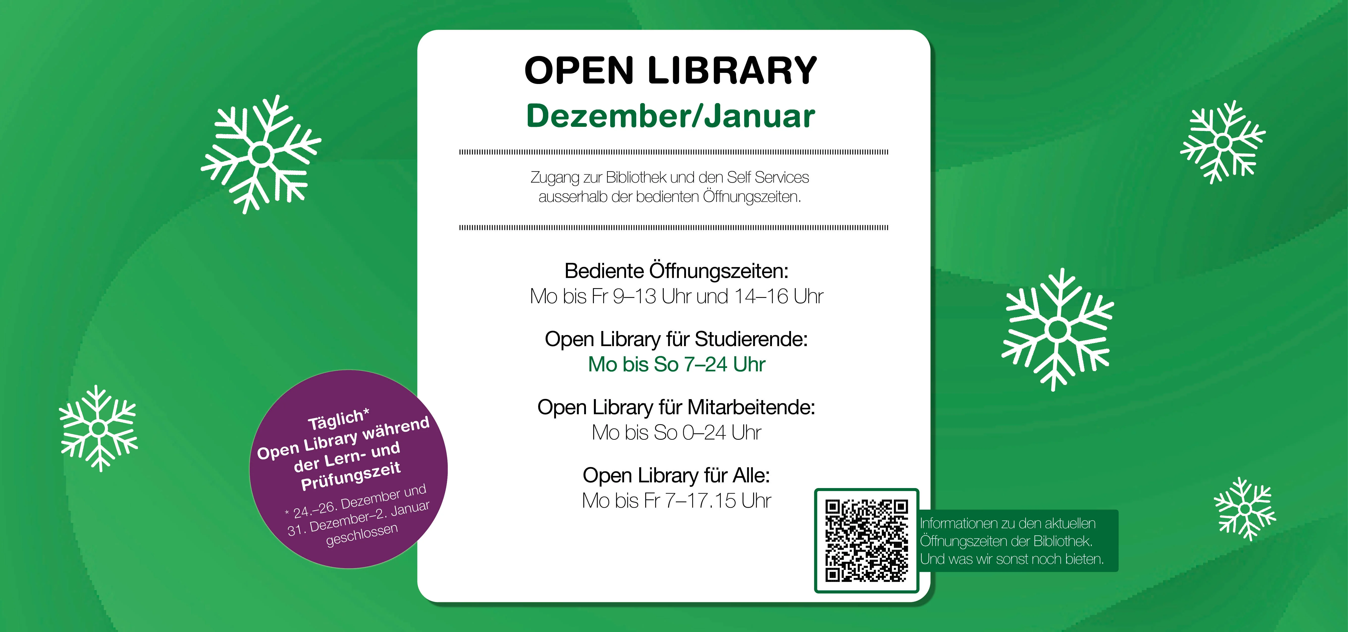 Für ZHAW-Studierende erweitert die Hoschulbibliothek Wädenswil im Dezember und Januar die Open-Library-Zeiten.