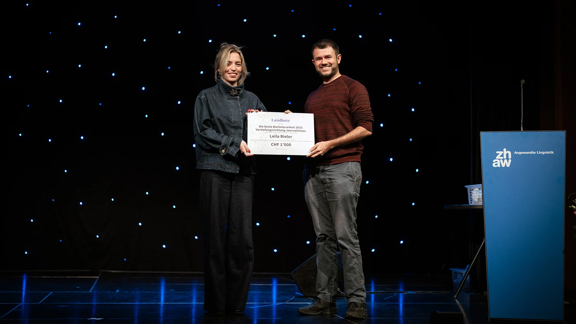 Ein besonderer Höhepunkt des Abends waren die Ehrungen herausragender Leistungen. Nicola Cathomas, Raphaela Balli und Jan Wattenhofer wurden für die besten Notendurchschnitte ausgezeichnet – ein Preis, der vom Flughafen Zürich gesponsert wurde. Vom Landboten erhielt Leila Bieler die Auszeichnung für die beste Bachelorarbeit im Bereich Journalismus. In ihrer Arbeit mit dem Titel «Selbst- und Fremddarstellungen in Videos der rechtsextremen Gruppierung «Junge Tat» – drei multimodale Analysen» widmet sich mit wissenschaftlicher Exzellenz und journalistischem Können einem gesellschaftlich äusserst relevanten Thema.