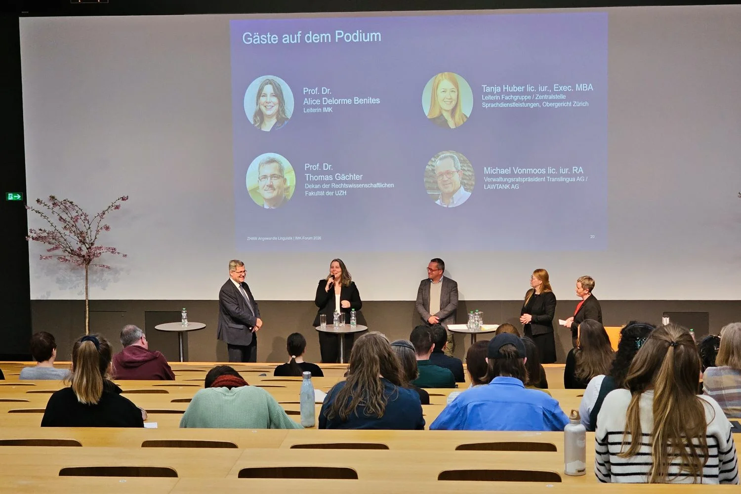 Im Anschluss diskutierten Tanja Huber (lic. iur., Exec. MBA; Leiterin Fachgruppe Sprachdienstleistungen am Obergericht Zürich), Michael Vonmoos (lic. iur. RA; Verwaltungsratspräsident Translingua AG / LT LAWTANK AG), Prof. Dr. Thomas Gächter und Prof. Dr. Alice Delorme Benites (Leiterin IMK Institut für Mehrsprachige Kommunikation der ZHAW) über Qualitätssicherung und die Anforderungen der mehrsprachigen Kommunikation in Hochrisiko-Kontexten.