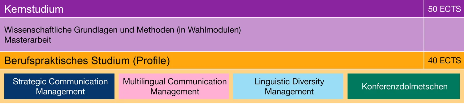Das Masterstudium setzt sich zusammen aus einem wissenschaftlich orientierten Kernstudium und einem berufspraktischen Studium in einem von vier Profilen: Strategic Communication Management, Multilingual Communication Management, Linguistic Diversity Management oder Konferenzdolmetschen.