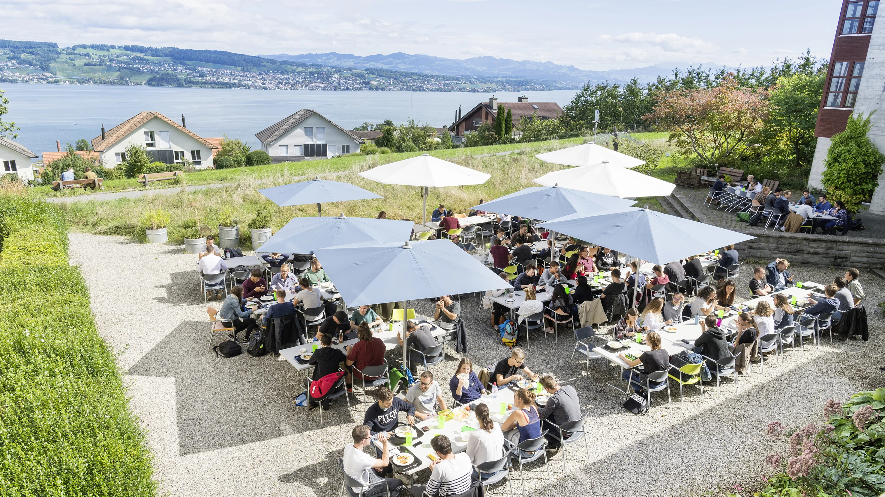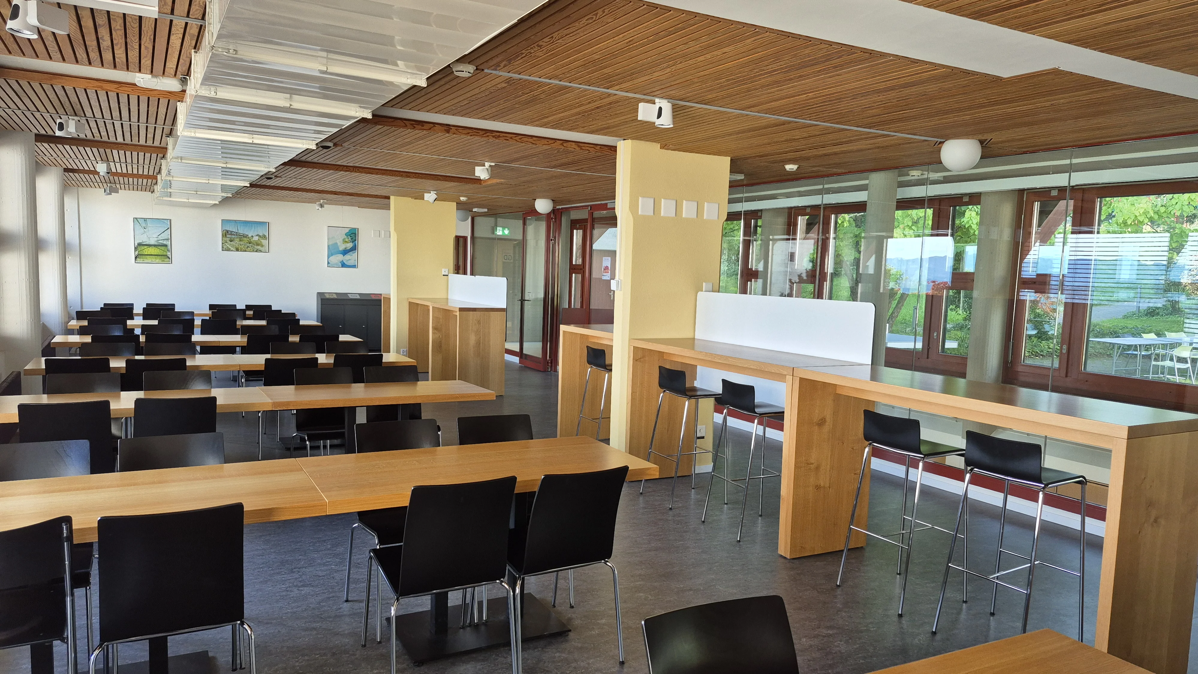 Eignet sich gut für Apéros sowie als Ergänzung zur Mensa. Schulbetrieb muss berücksichtigt werden (während des Tages wird der Raum zum Essen und Lernen benötigt).