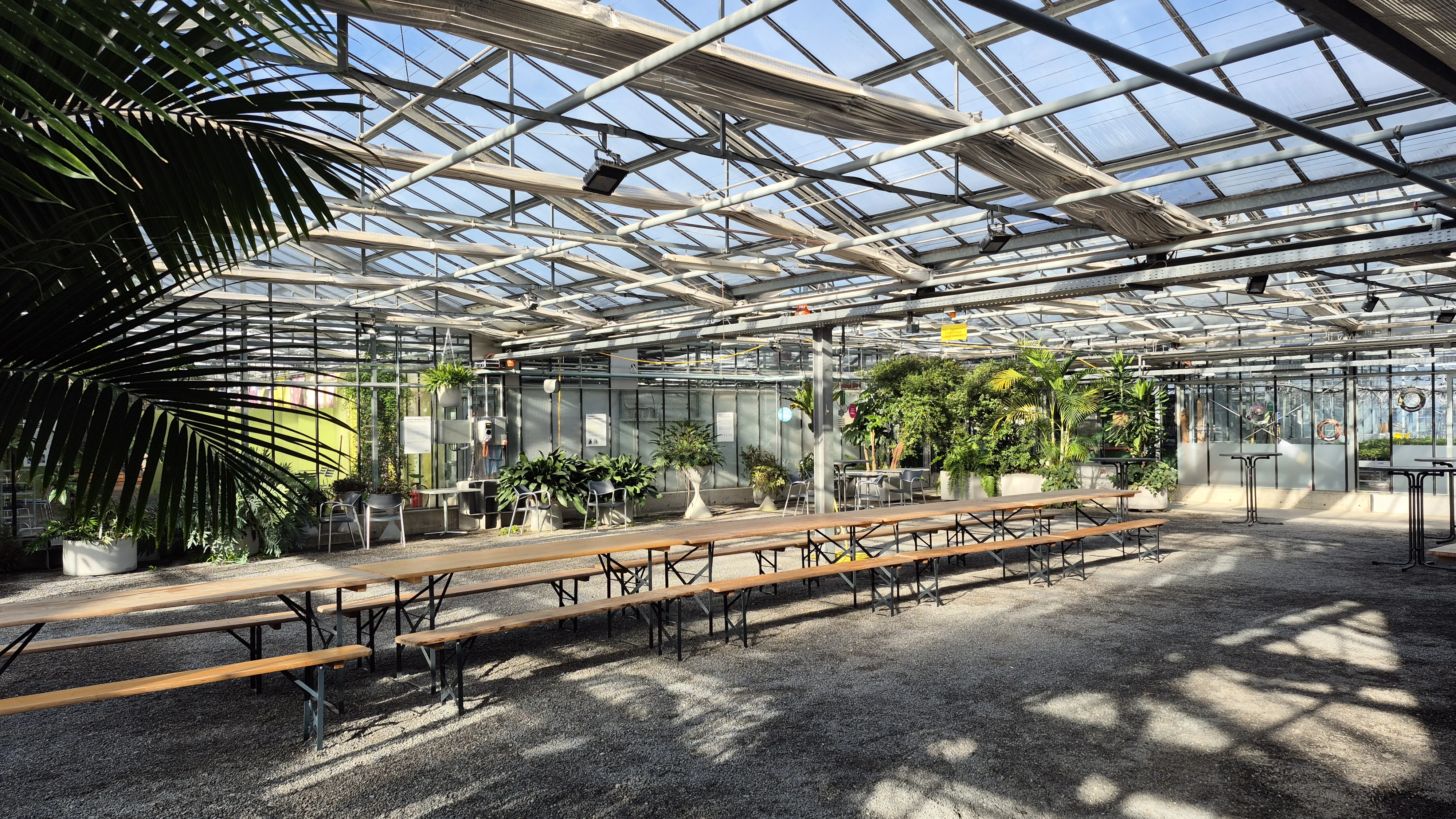 Das Kalthaus im Gebäude GC eignet sich für Veranstaltungen bis 200 Personen. Der Aussenbereich kann mit einbezogen werden, dabei soll Rücksicht auf die Nachbarn und die Natur genommen werden.