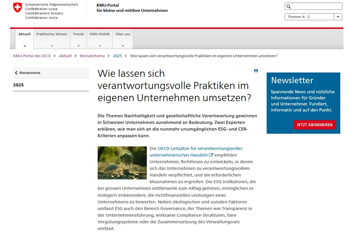 Die Themen Nachhaltigkeit und gesellschaftliche Verantwortung gewinnen in Schweizer Unternehmen zunehmend an Bedeutung. Prof. Christian Vögtlin, Co-Leiter des ZHAW Zurich Center for Sustainability Leadership, erklärt im “Monatsthema” des KMU-Portals, wie man sich an die nunmehr unumgänglichen ESG- und CSR-Kriterien anpassen kann.
