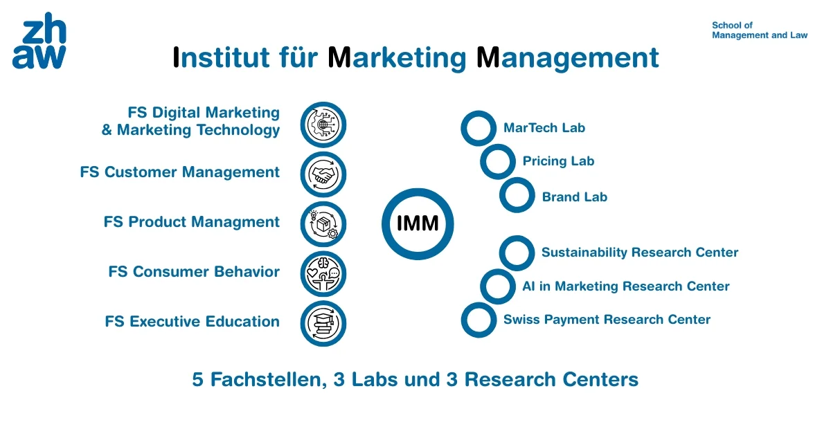 Die Fachstellen, Labs und Research Centers des Institut für Marketing Management sind vielfältig ausgerichtet und decken alle wesentlichen Bereiche des modernen Marketings ab. Dazu gehören Forschung und Entwicklung, Weiterbildung sowie die Lehre. Durch diese breite Aufstellung verbinden wir wissenschaftliche Expertise mit praxisnahen Lösungen und stellen sicher, dass neue Erkenntnisse aus der Forschung direkt in die Ausbildung und Anwendung einfliessen.