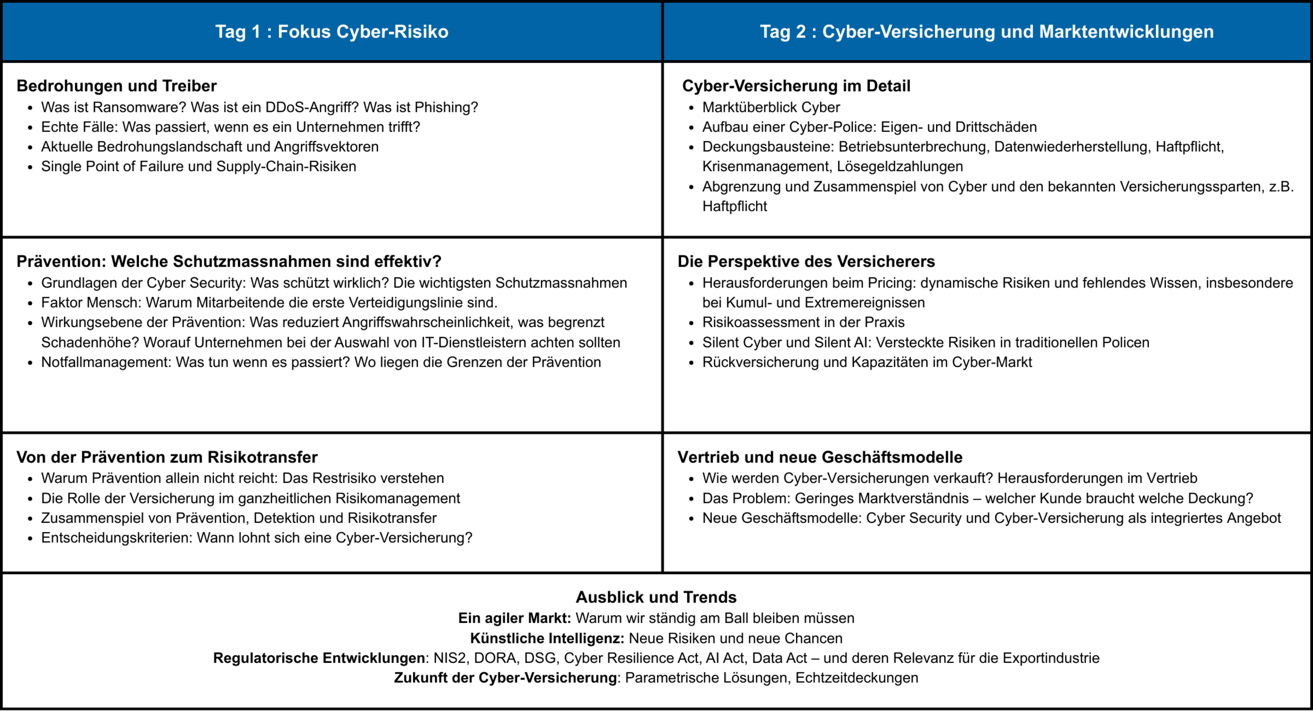 Cyber-Risiken betreffen heute jede Branche und jede Führungsebene. Dieser Kurs richtet sich an alle, die das Thema ganzheitlich verstehen wollen: von der Bedrohungslage über wirksame Prävention bis hin zu Versicherungslösungen. In zwei Tagen erhalten Sie das Gesamtbild – praxisnah, kompakt, ohne IT-Vorkenntnisse und direkt anwendbar im Alltag.