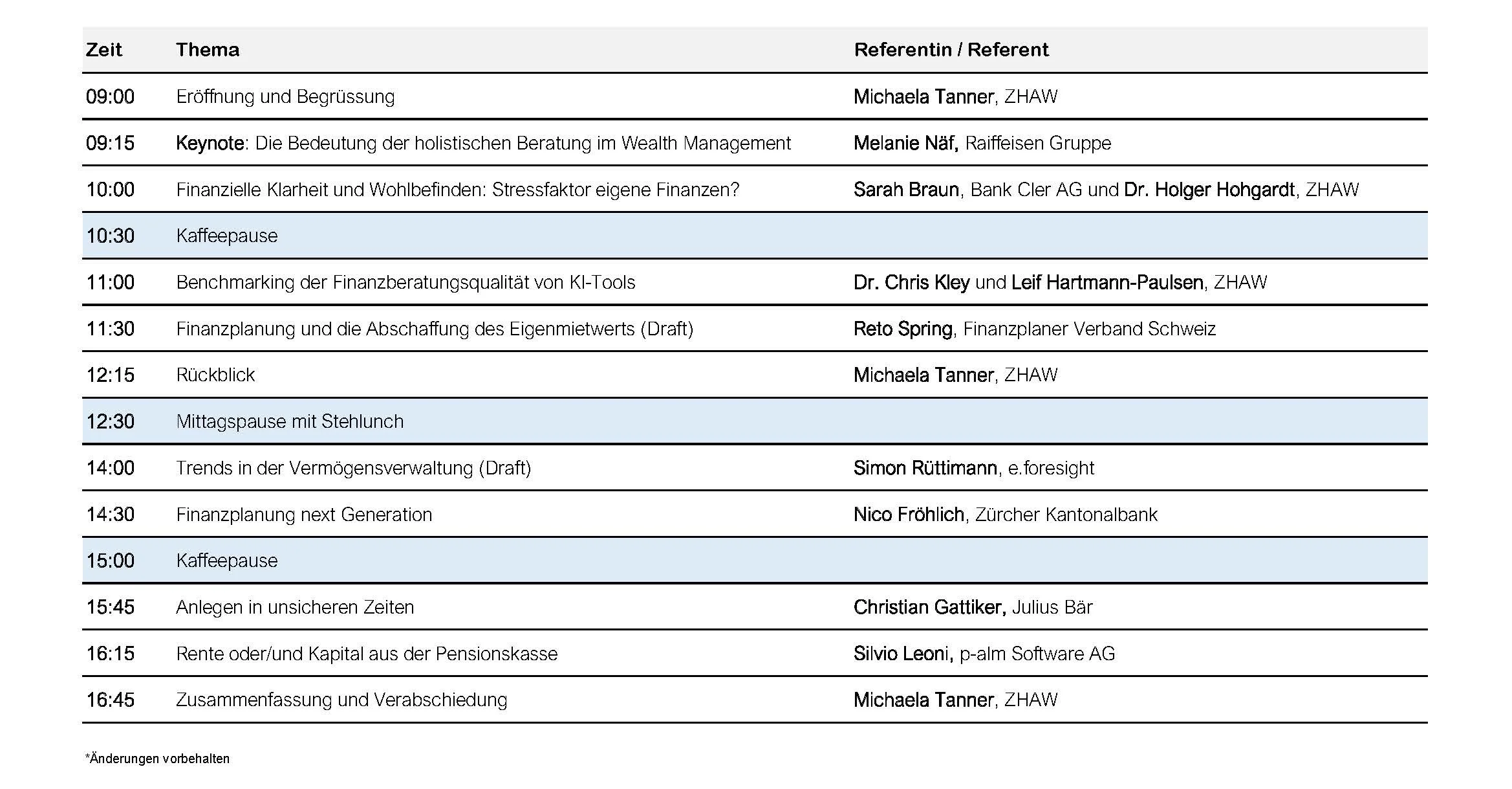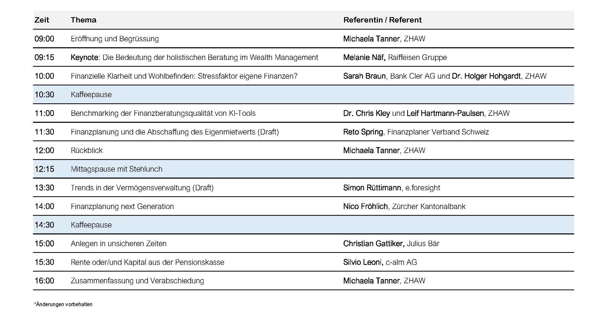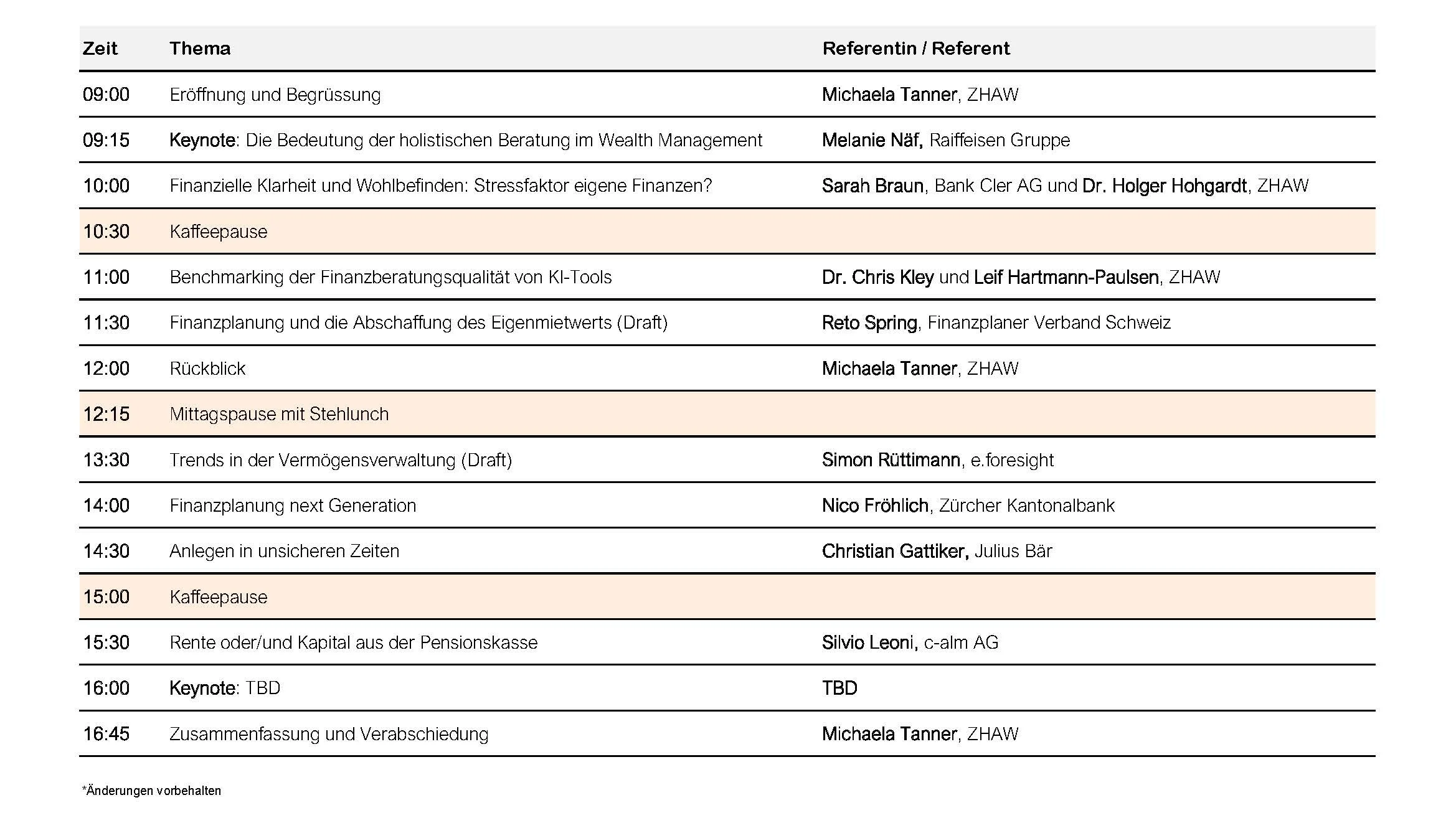 Referierende: Die Konferenz richtet sich an berufliche Fachpersonen und an Forschende und Studierende aus Universitäten und Hochschulen, die sich mit der fachlichen oder der Managementsicht des Wealth Planning auseinandersetzen.