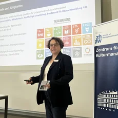 Géraldine Zeuner (Wissenschaftliche Mitarbeiterin, Nachhaltige Entwicklung, Bundesamt für Raumentwicklung ARE) berichtete von ihrer langjährigen Erfahrung im Bereich internationale Kulturförderung und über ihre Rolle als Expertin und Beraterin zur Umsetzung der Agenda 2030. Kultur steht international zunehmend unter Druck. Finanzierungslücken, Konflikte und Klimawandel fordern sie heraus. Gemäss Zeuner ist es deshalb wichtig, dass Kulturmanager:innen es gelingt, die Relevanz von Kunst, Kultur und kulturellen Rechten sichtbar zu machen und sie es verstehen, auf politischer Ebene präzise sowie strategisch Einfluss zu nehmen.
