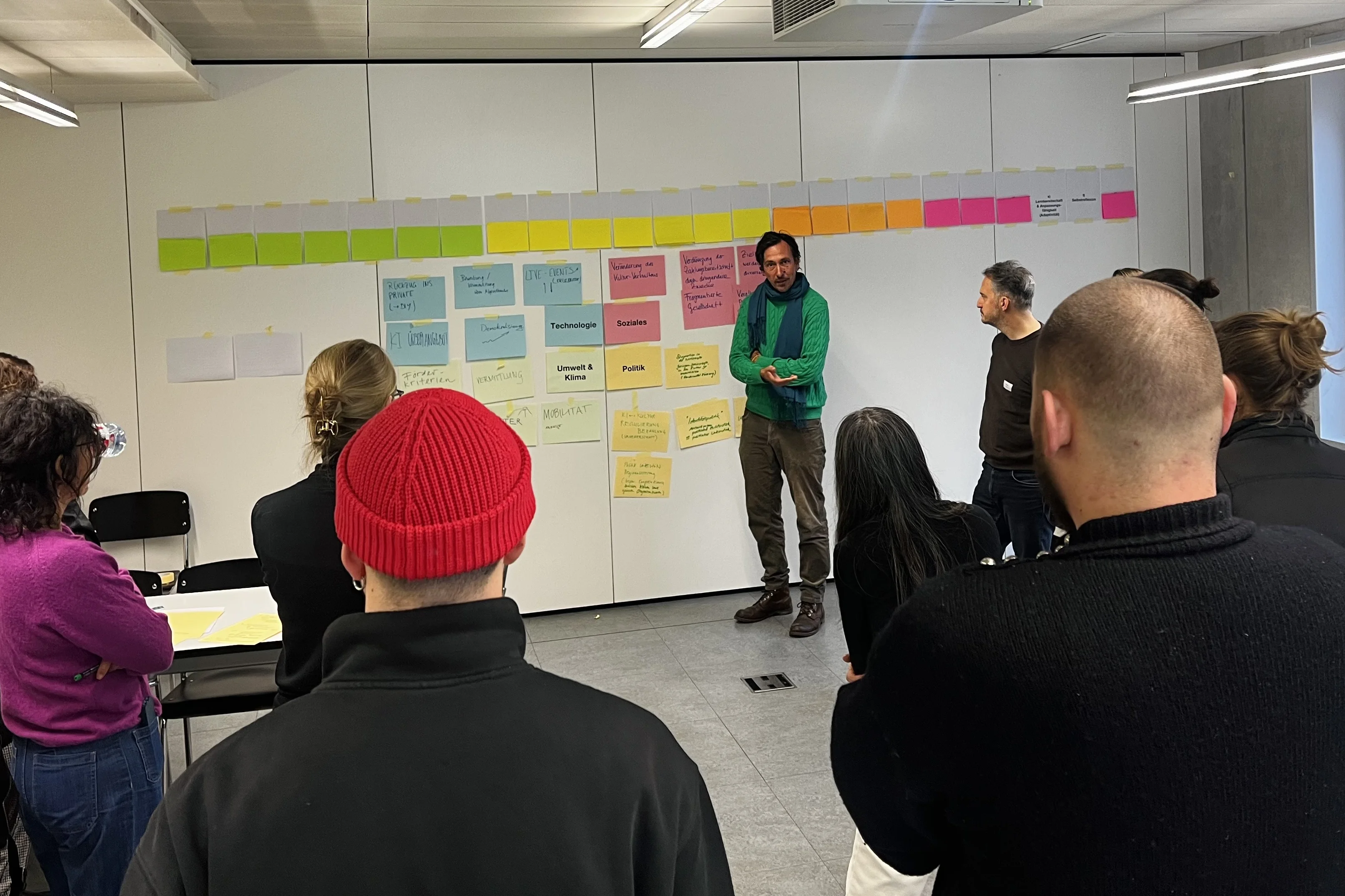 Ausgehend von vier zentralen Querschnittsthemen – Umwelt & Ökologie, Soziales, Technologie und Politik – entwickelten die Teilnehmenden in Gruppen Zukunftsszenarien für das Jahr 2032. Dabei ging es nicht um wünschenswerte Entwicklungen, sondern vielmehr um plausible Zukunftsbilder. Zunächst wurden dafür die Rahmenbedingungen entworfen, die den Kulturbereich künftig prägen könnten, etwa gesellschaftliche Trends, ökologische Herausforderungen oder technologische Entwicklungen. Anschliessend diskutierten die Gruppen mögliche Veränderungen im Kulturbereich selbst, beispielsweise in Bezug auf Publikumsverhalten, Produktionsprozesse oder Finanzierungsmodelle.