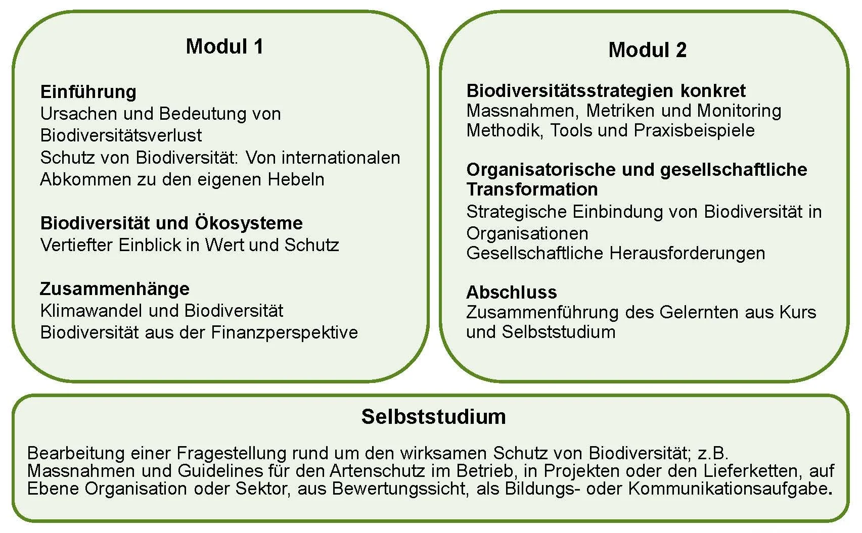 Nach Abschluss des CAS sind die Teilnehmenden kompetent, die Auswirkungen der Organisation auf die Biodiversität und die Risiken für die Organisation durch den Biodiversitätsverlust zu erheben, geeignete Massnahmen zur Vermeidung und Begrenzung umzusetzen und deren Wirkung zu überprüfen. Sie tragen aktiv zur Förderung der Biodiversität, des gesellschaftlichen Verständnisses dafür und damit zur langfristigen Absicherung der Grundlage unserer Wirtschaft und Gesellschaft bei.