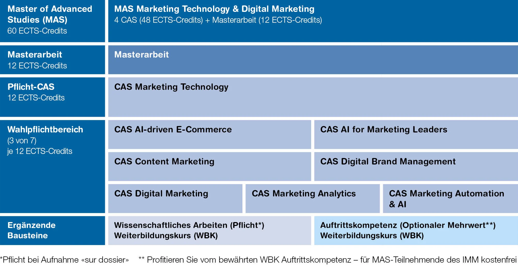 Der CAS Marketing Technology ist fester Bestandteil des MAS-Programms. Aus allen anderen (unten aufgeführten) CAS, sind drei weitere zu wählen. Nach erfolgreicher Absolvierung von vier CAS kann die MAS-Arbeit gestartet werden.