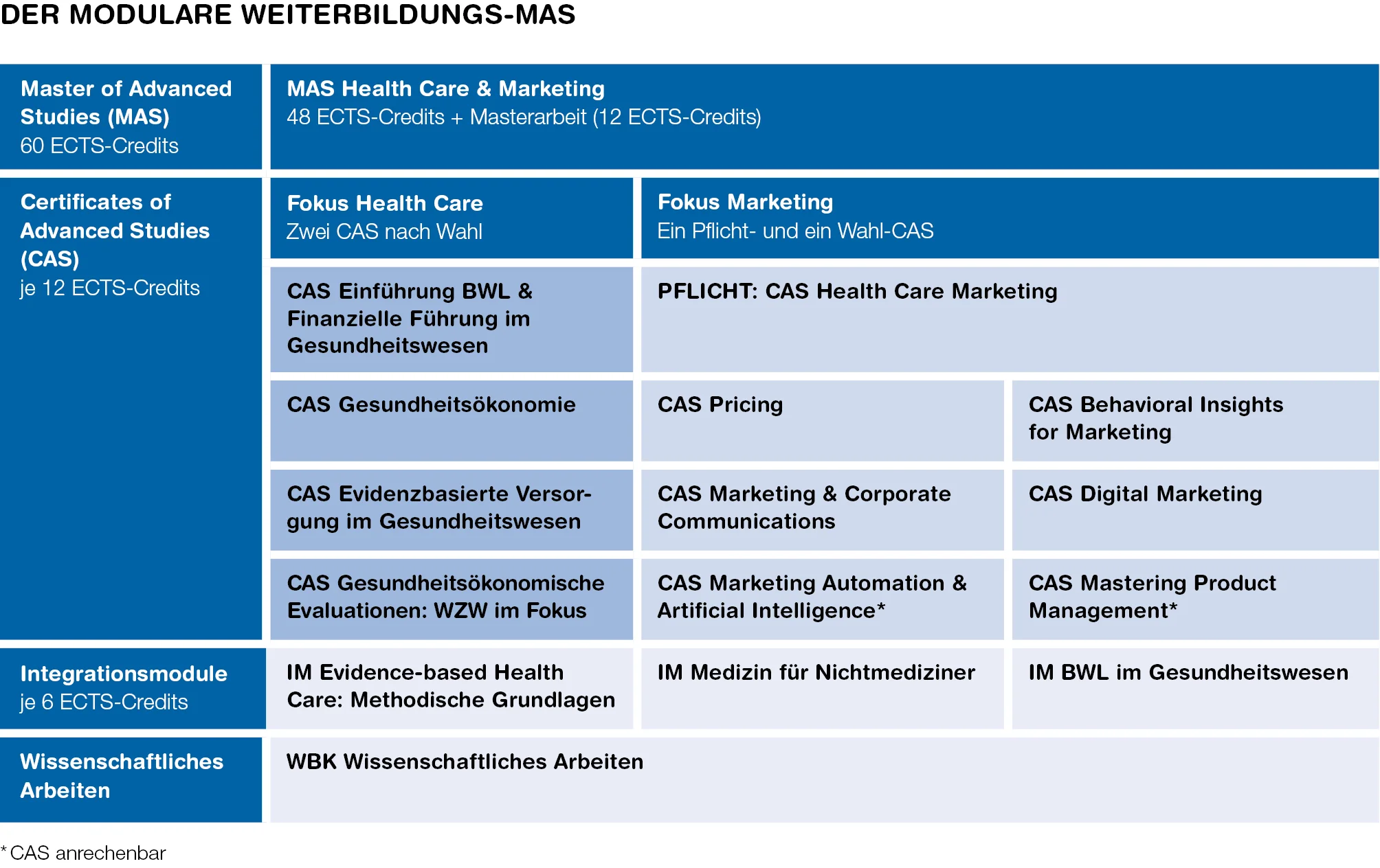 Folgende CAS können dem MAS Health Care & Marketing angerechnet werden: