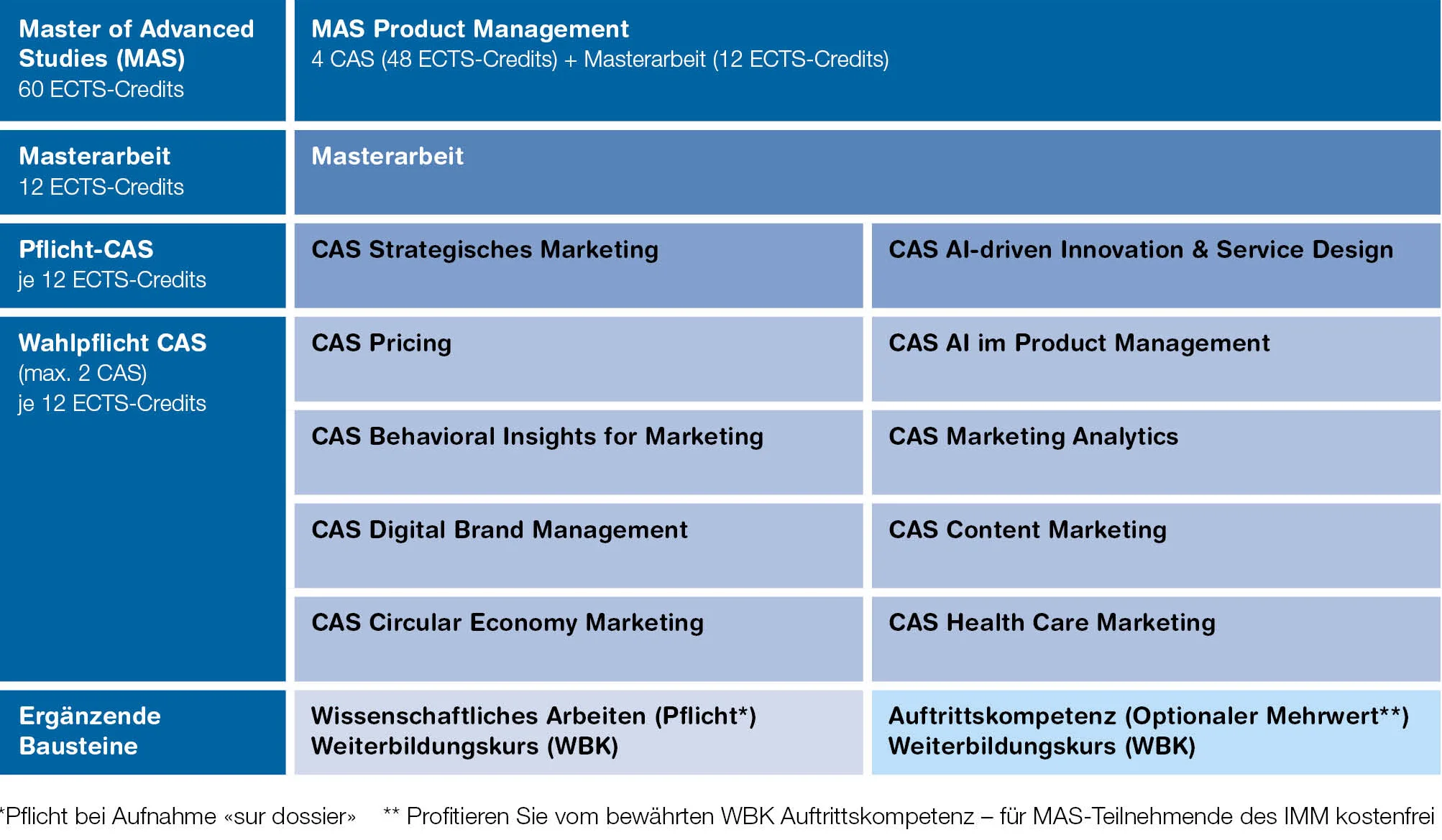 Die modulare Struktur des MAS Product Management bietet Studierenden die Möglichkeit, den Masterstudiengang inhaltlich individuell zu gestalten. Je nach persönlichen Wünschen und Karrierezielen wählen die Teilnehmenden zusätzlich zu dem obligatorischen CAS Strategisches Marketing und dem CAS AI-driven Innovation & Service Design zwei weitere Zertifikatslehrgänge aus dem folgenden Portfolio aus: