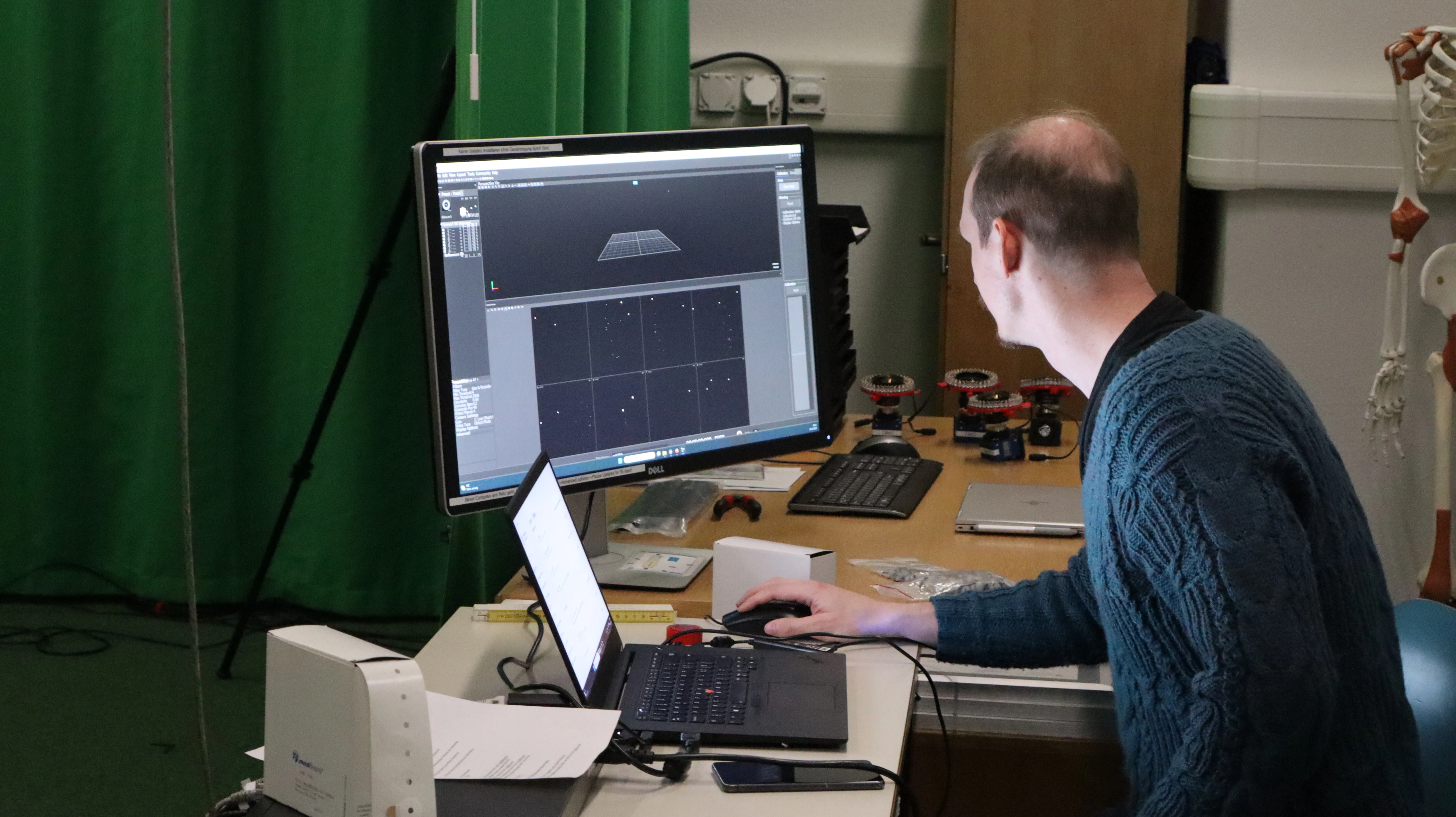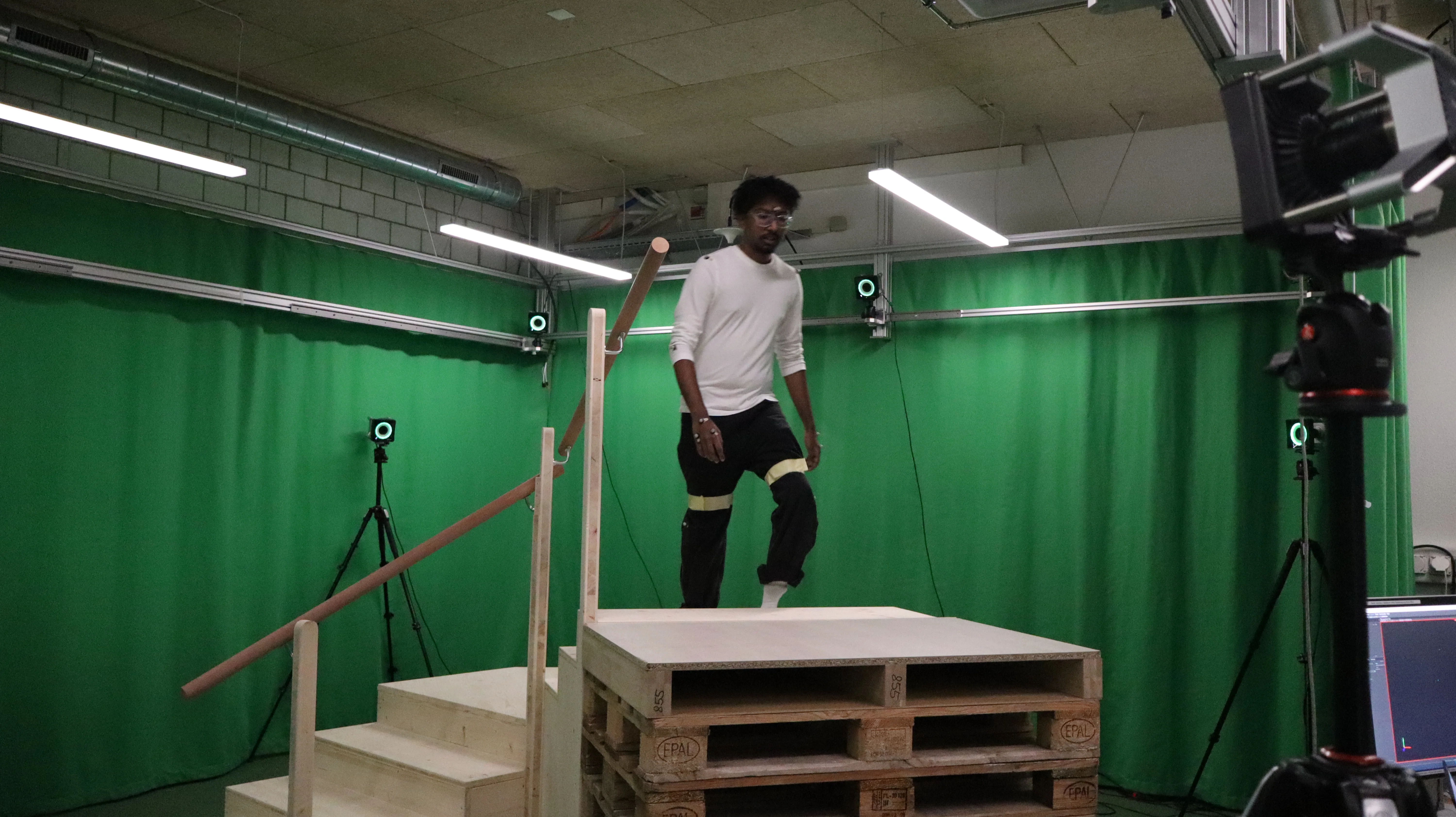 R.v.M. & J.G.: Wir mussten den Raum spezifisch für diese Aufnahmen einrichten. Den Raum, unser Ganglabor, hatten wir bereits zur Verfügung, dieser ist extra für Bewegungsaufnahmen eingerichtet und mit der benötigten Technologie ausgestattet. Zum Beispiel ist hier auch Silhouetten-Tracking möglich. Was bei diesen Aufnahmen besonders war, ist natürlich die Test-Treppe. Diese wurde von einem Schreiner produziert und wir mussten sie gemeinsam im Raum installieren. Danach wurden die Kameras auf den effektiven Messbereich ausgerichtet, das ist der grösste Aufwand. Sobald alles stand, nahmen wir Probemessungen vor und schauten verschiedene Aufnahmen mit Alexandra Navratil an. Insgesamt dauerte es fast eine Woche, den Raum für die Aufnahmen vorzubereiten.