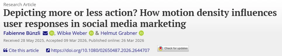 The paper Depicting more or less action? How motion density influences user responses in social media marketing by F. Bünzli, W. Weber, and H. Grabner got published in the International Journal of Advertising, 2026.