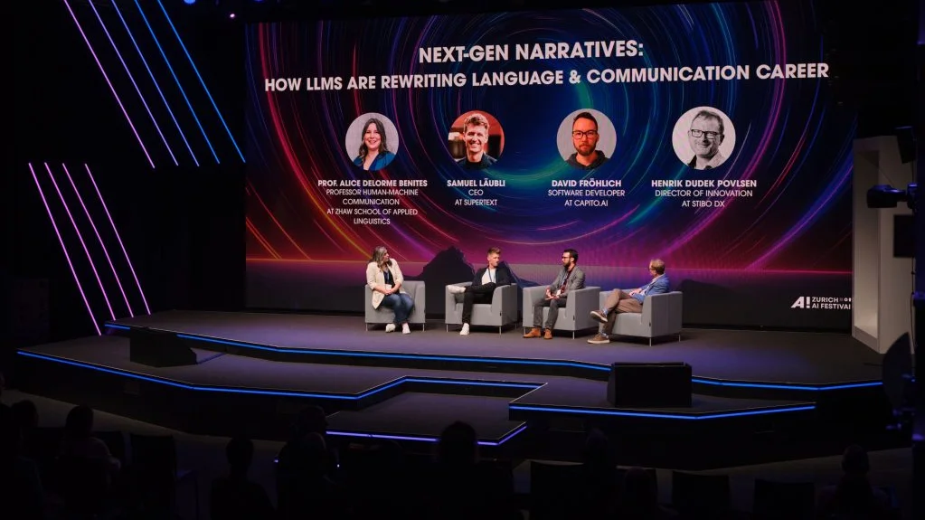 Alice Delorme Benites, Professorin am Departement Angewandte Linguistik, leitete die Diskussion auf der Hauptbühne zum Thema «Next-Gen Narratives: How LLMs Are Rewriting Language & Communication Careers». Gemeinsam mit Samuel Läubli (Supertext), David Fröhlich (capito.ai) und Henrik Dudek Povlsen (Stibo DX) diskutierte sie über Sprachberufe, neue Arbeitsprozesse in der Kommunikation und die Berufschancen im KI-Zeitalter.