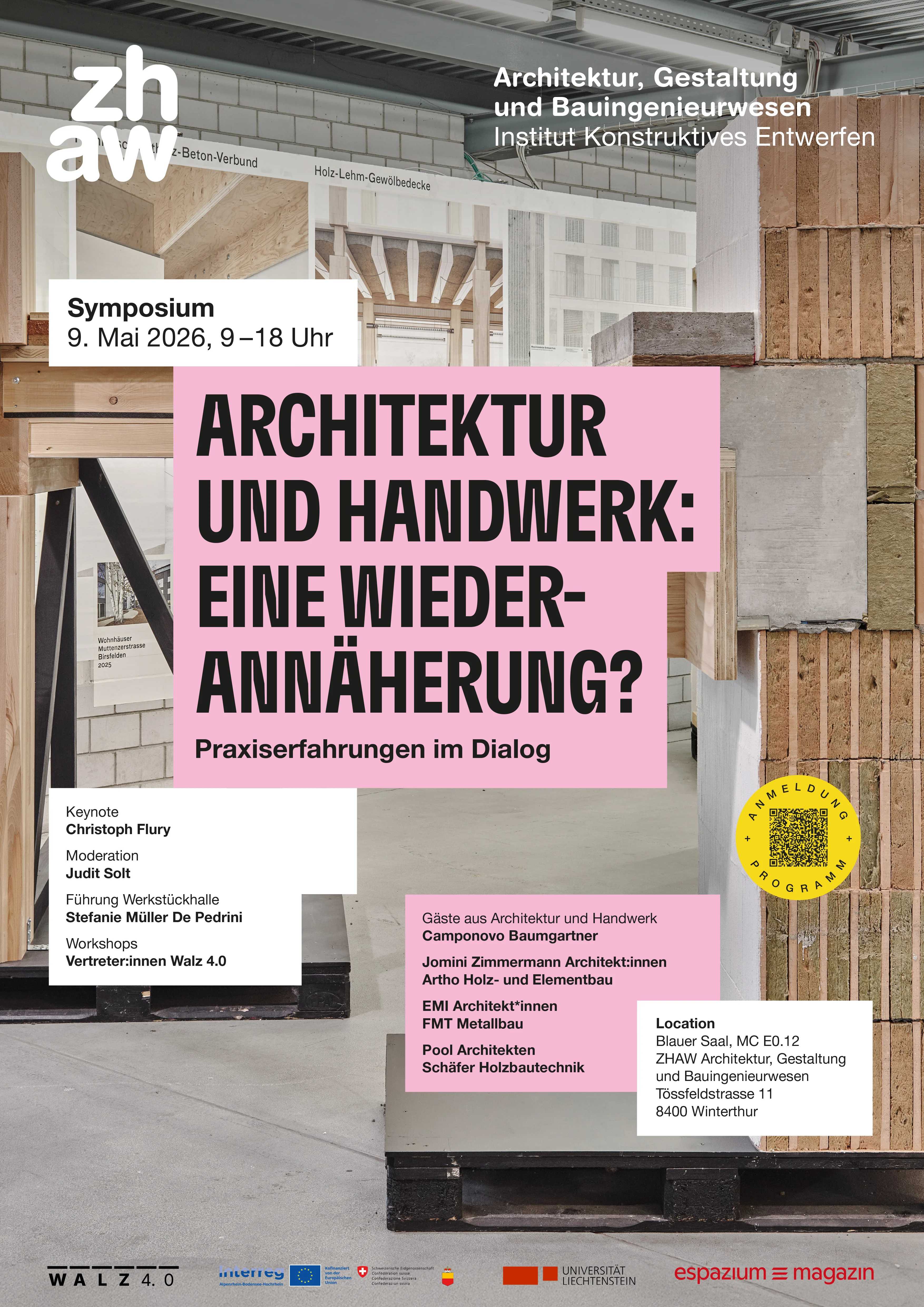 Neben den Vorträgen bieten Workshops und Diskussionsrunden Raum für den vertieften Austausch zur Frage der Einbindung von Handwerkswissen in der Architekturlehre und der Zusammenarbeit zwischen Planung und Handwerk. Die Führung durch die Werkstückhalle durch deren Leiterin schafft den Bezug zu den 1:1 Mockups und rundet mit dem Apéro das Programm ab.