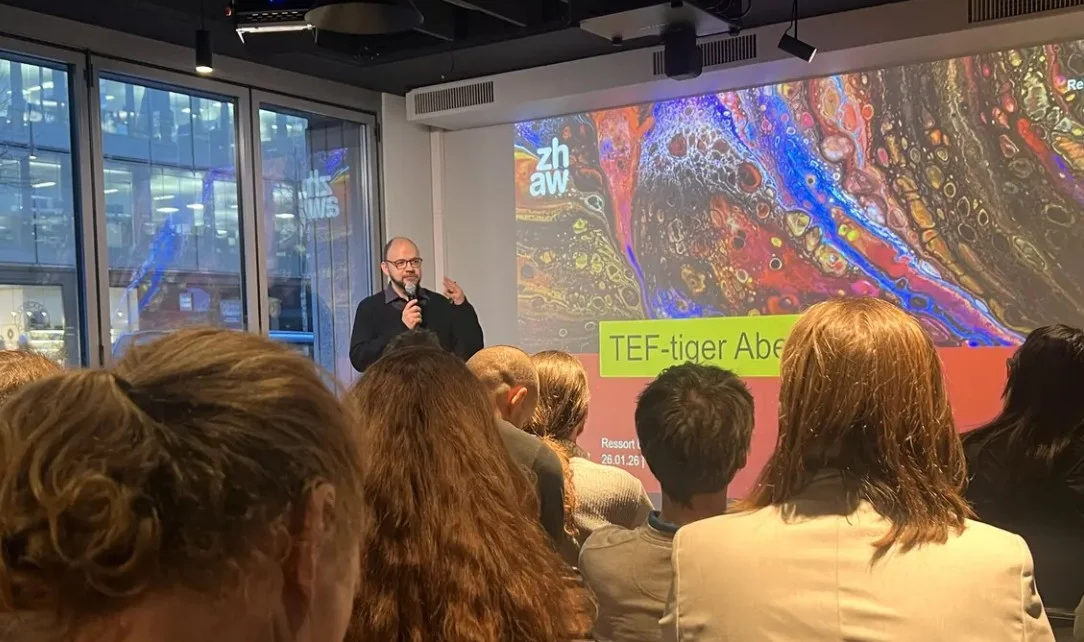 Bevor Thomas Korner um 17.00 Uhr eine kurz-und-bündige Ansprache hält, ist der Geräuschpegel im Nüü bereits hoch – über 40 Personen, die am TEF beteiligt sind, diskutieren angeregt. Sie kommen aus den verschiedensten Bereichen, Departementen und Instituten der ZHAW.
