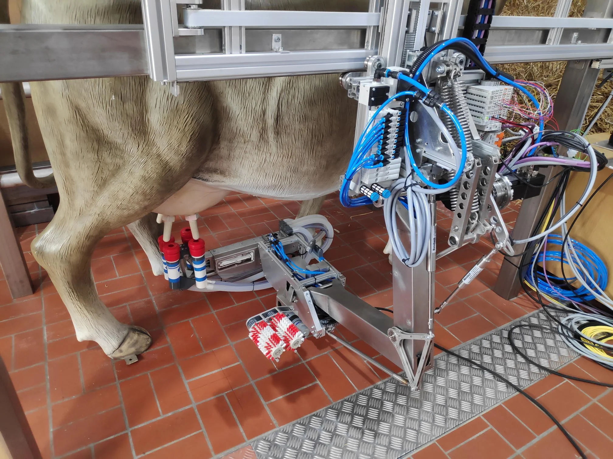 Sutter Landtechnik GmbH, a company that has been manufacturing milking machines and installing milking robots in Switzerland for many years, recognized this need and decided to develop its own product optimized for the Swiss market. With the support of the IMS at ZHAW, a functional prototype was developed in a project funded by the Swiss Innovation Agency Innosuisse. This prototype is suitable for the requirements of a typical medium-sized dairy farm in Switzerland.
