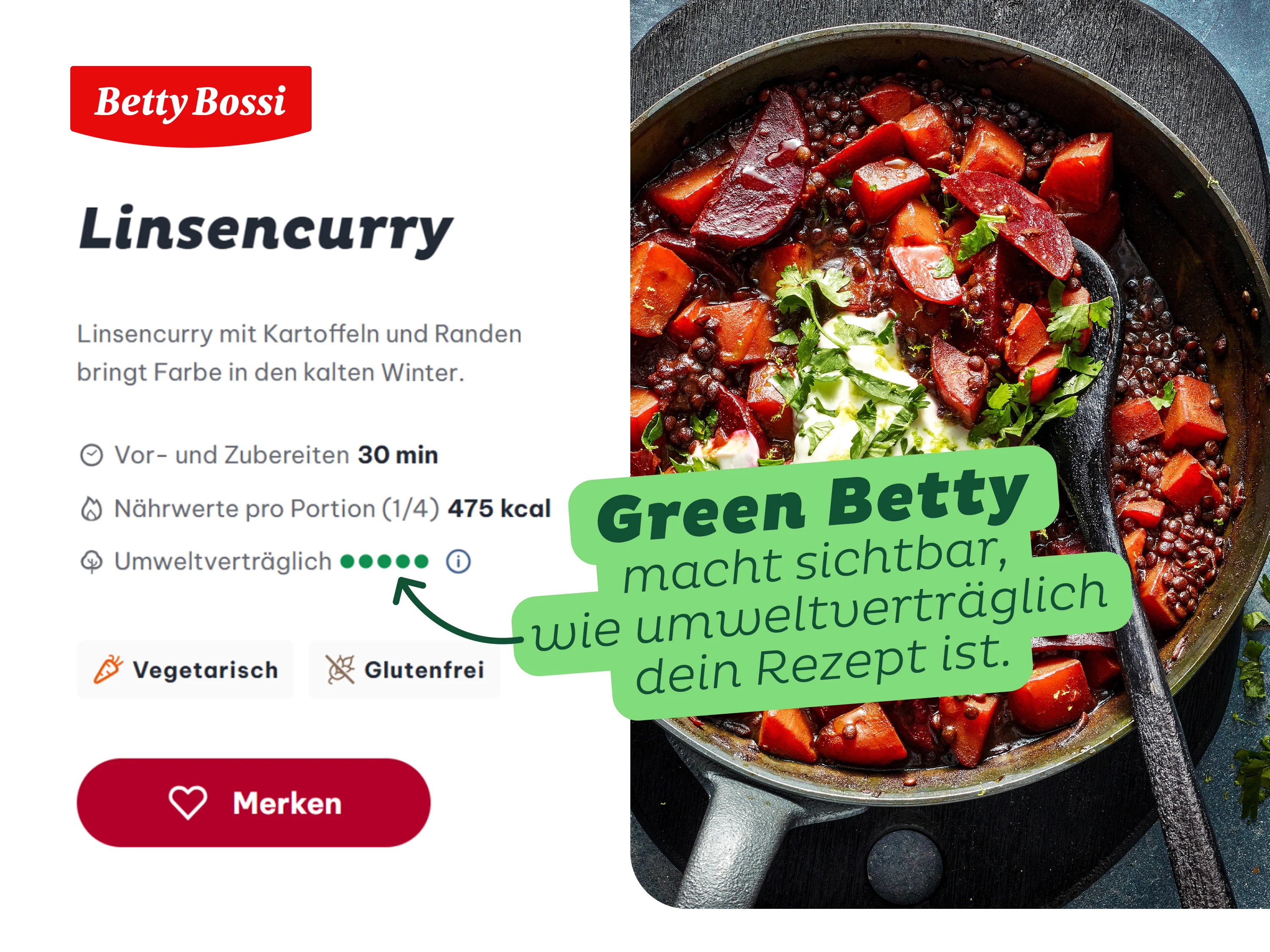 Green Betty is a joint project by Betty Bossi and the ZHAW that makes the environmental impact of recipes transparent and promotes sustainable everyday cooking. The assessment is based on the Menu Sustainability Index (MSI), which automatically calculates the environmental impact of meals and displays the results directly within the digital recipes. This provides users with clear guidance on the environmental compatibility of their dishes and enables them to choose seasonal, resource-efficient and environmentally friendly recipes.