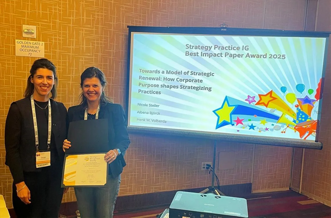 Dr. Björck’s award-winning paper, entitled “Towards a Model of Strategic Renewal: How Corporate Purpose Shapes Strategizing Practices”, was co-authored with Nicole Steller and Prof. Henk W. Volberda. The study explores how a clearly defined corporate purpose can function as a strategic mechanism for organizational renewal – not merely as rhetorical guidance, but as a connecting force between strategizing and organizing, ideals and pragmatism, symbolism and consequential action.