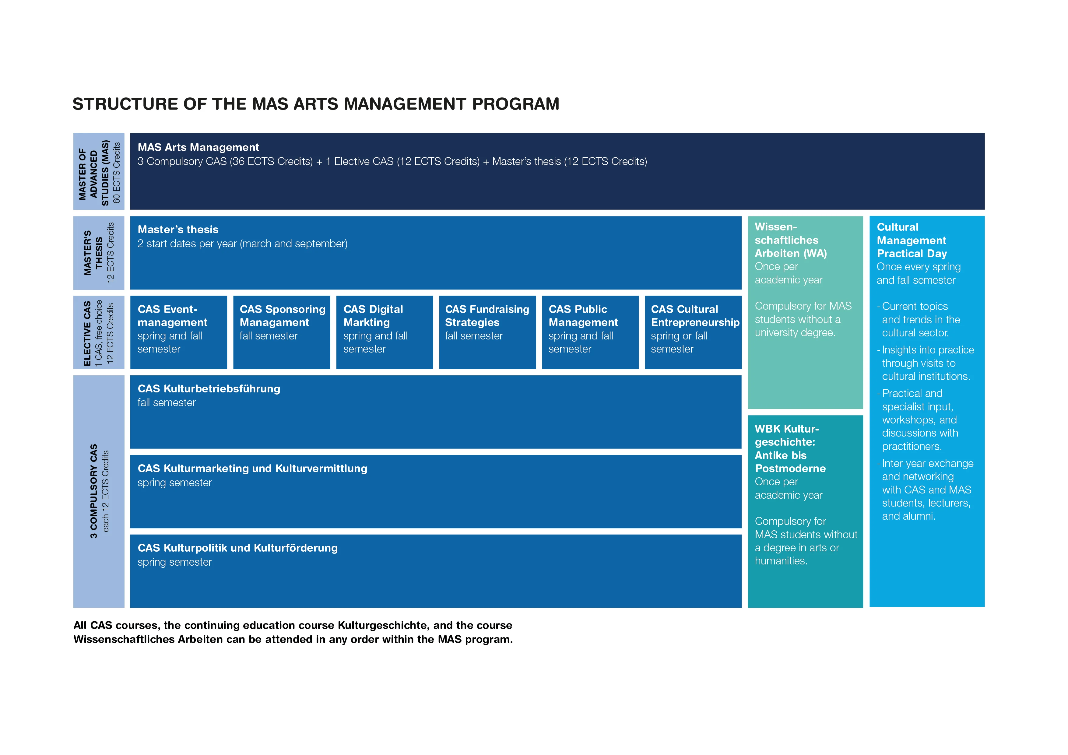 The Master’s program curriculum builds on the program objectives and promotes interdisciplinary practice in cultural management. The four CAS courses cover the central topics of cultural management: management know-how, financing, marketing and communication, as well as perspectives from cultural policy, cultural law, and cultural theory. This content is structured in a way that enables graduates to competently fulfill their roles as mediators between art, culture, education, business, society, and politics.