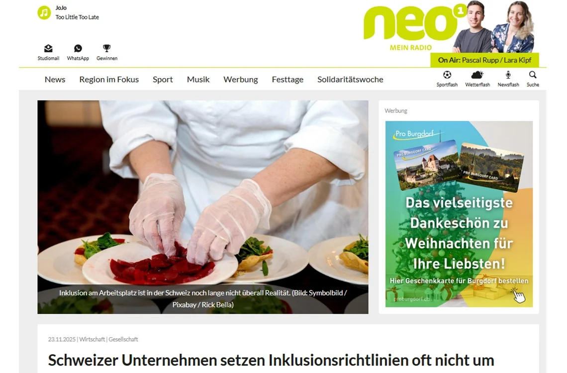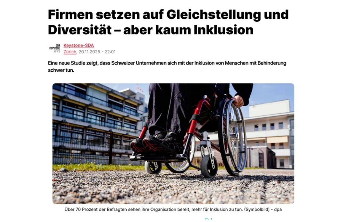 Many Swiss companies still struggle to include people with disabilities on an equal basis. The radio report deals with the Swiss Diversity Study 2025, conducted by the Swiss Diversity association and BKW under the leadership of ZHAW. Specialists from large corporations and SMEs were surveyed.