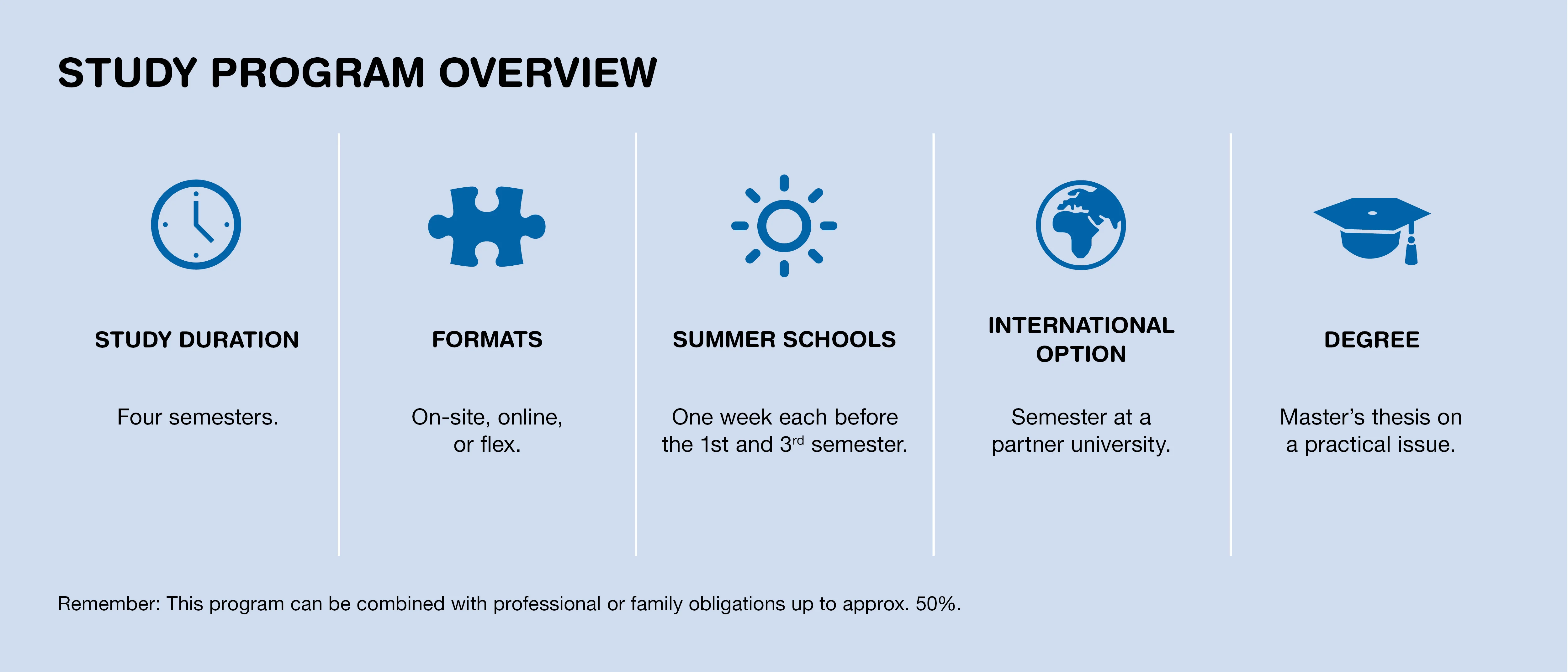 Duration: 4 semesters (allows balancing work and family responsibilities of 60 percent).