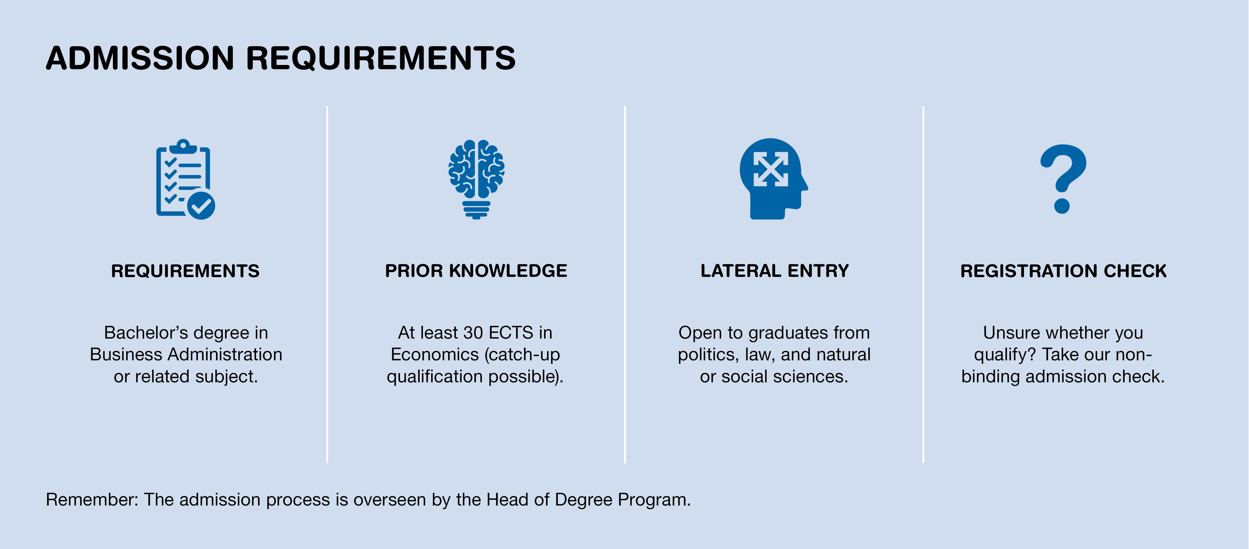 - Proof of prior knowledge in economics amounting to at least 30 ECTS credits (catch-up qualifications are possible)