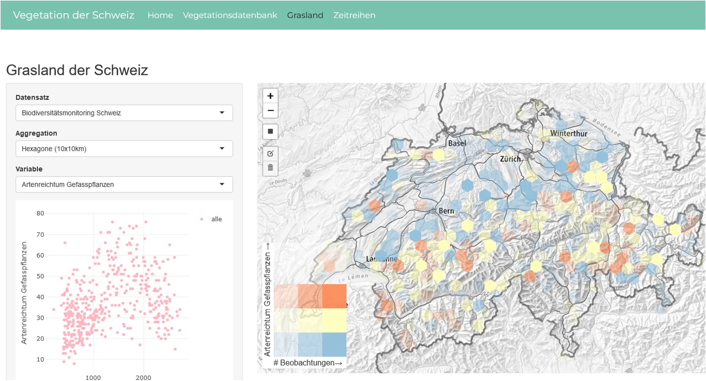 Le portail d'information interactif sur la diversité végétale et la végétation en Suisse (vegetation.ch) contient différents «Dashboards» créés à l'aide de la technologie Shiny-R. Ils visualisent différents aspects de la diversité floristique et de la végétation en Suisse ainsi que leurs changements au fil du temps. Les utilisateurs peuvent explorer de manière interactive la richesse en espèces de certains habitats dans certaines régions ou l'évolution des valeurs indicatrices moyennes au fil du temps.